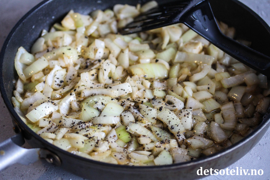 Hakk opp løken og ha løkbitene i pannen sammen med smøret. Kvern over litt salt og pepper.