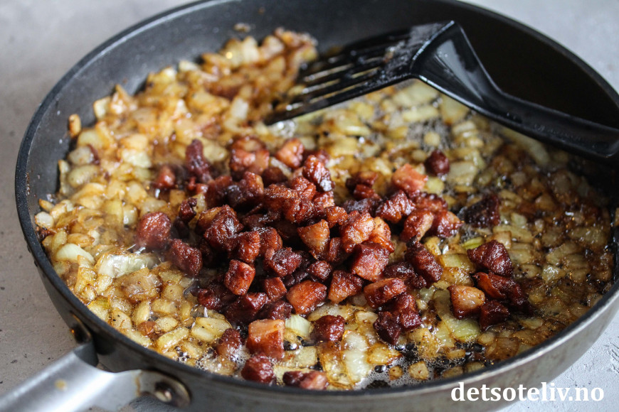Når løken er ferdigstekt, has baconbitene tilbake i pannen. Varm dette opp sammen rett før servering.