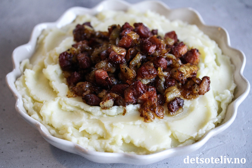 ♥ Brennende kjærlighet skal originalt lages med baconterninger, som jeg har brukt her. Disse avgir en god del mer fett enn bacon som kjøpes i skiver, og noe av meningen med denne retten er at løken skal stekes i baconfettet og at fettet deretter skal helles over potetmosen. Personlig må jeg innrømme at jeg likevel foretrekker vanlige, tynne baconskiver som jeg klipper i små biter - både fordi skivene gir litt mer kjøtt og mindre baconfett, og fordi skivene gjerne er mindre salte. Bruk det du liker best! 😊