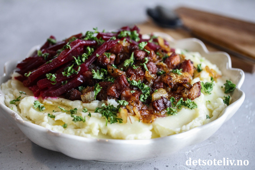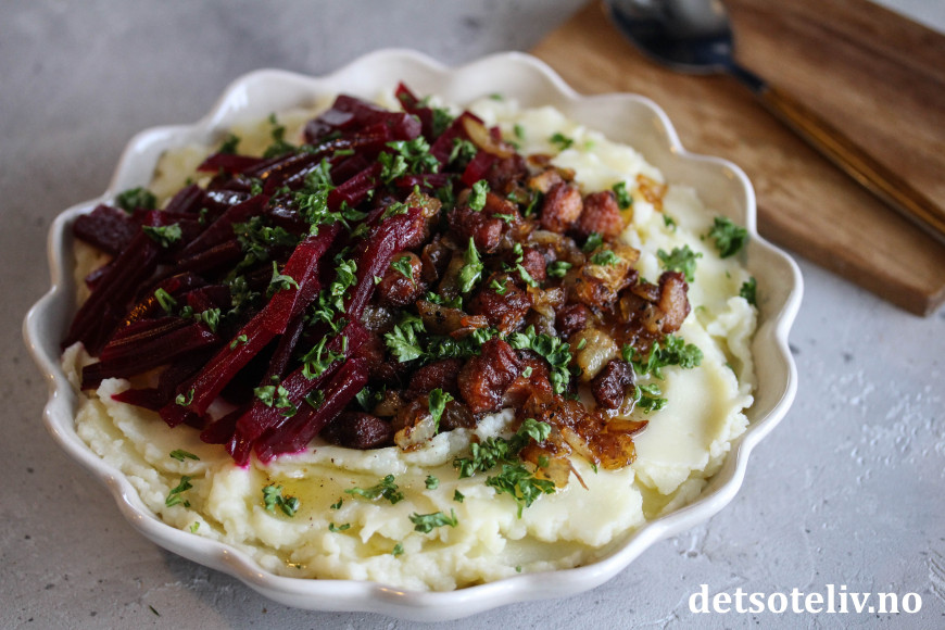 Retten består av hjemmelaget potetmos som dekkes med stekt løk og bacon, og gjerne også persille og syltede rødbeter. Dansk rugbrød er klassisk tilbehør.