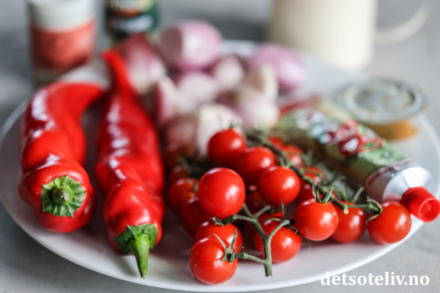 ♥ Jeg bruker her store spisspaprika, men vanlig rød paprika kan også brukes. Jeg synes smaken blir best med grillet paprika, men du kan til nød sløyfe dette og ha paprikabitene rett i pannen sammen med tomatene. Det går også an å kjøpe ferdiggrillet og flådd paprika.