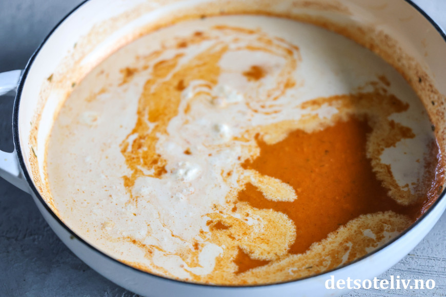 Ha innholdet tilbake i pannen og tilsett kremfløte.