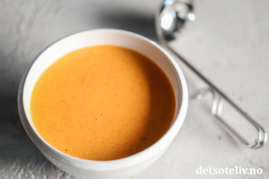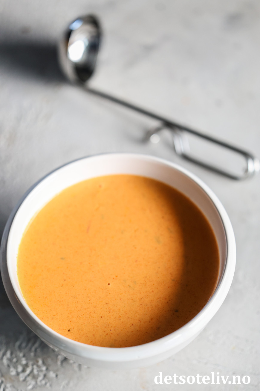 Den lekre rødoransje fargen kommer av paprika og tomat. I tillegg inneholder sausen mye annet godt som sjalottløk, hvitløk, smør, fløte og kyllingfond.