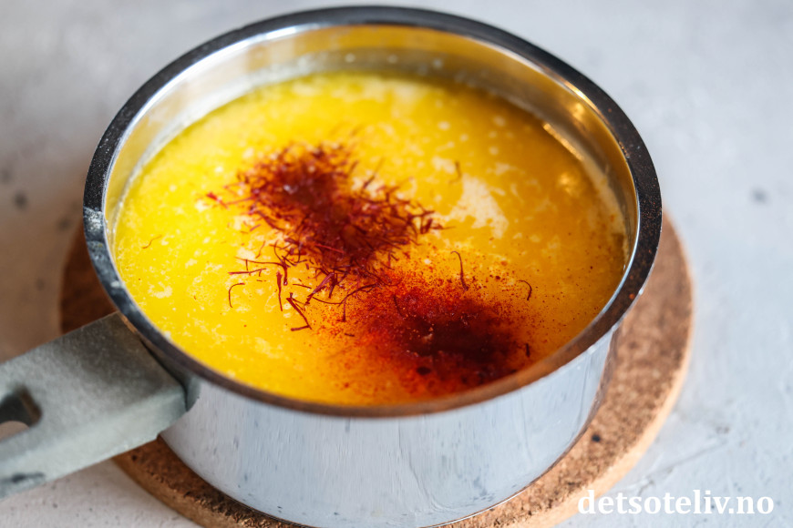 Knus safranen i morter, eller knus den litt ved å gni den mellom fingrene (du kan eventuelt også knuse den i morter sammen med litt sukker). Ha safranen i smørmelken.