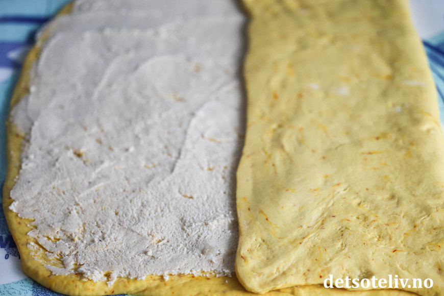 ♥ Jeg har her brukt deigen på Luciaboller (Lussekatter med kesam). Kesam gjør bollene ekstra saftige. Du kan også bruke en annen gjærdeig til å lage brettede safranboller hvis du foretrekker det.