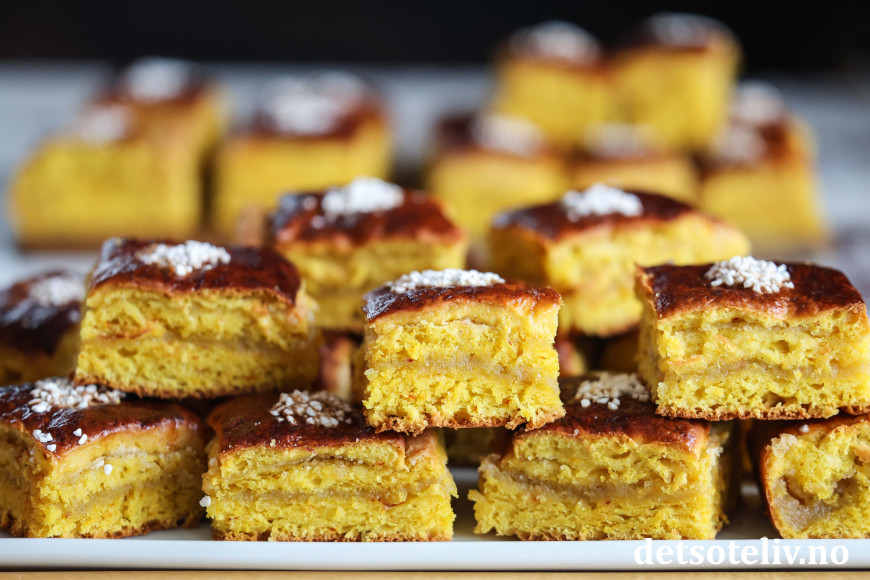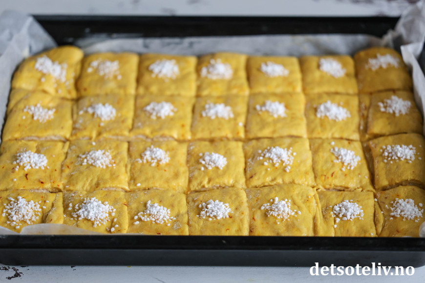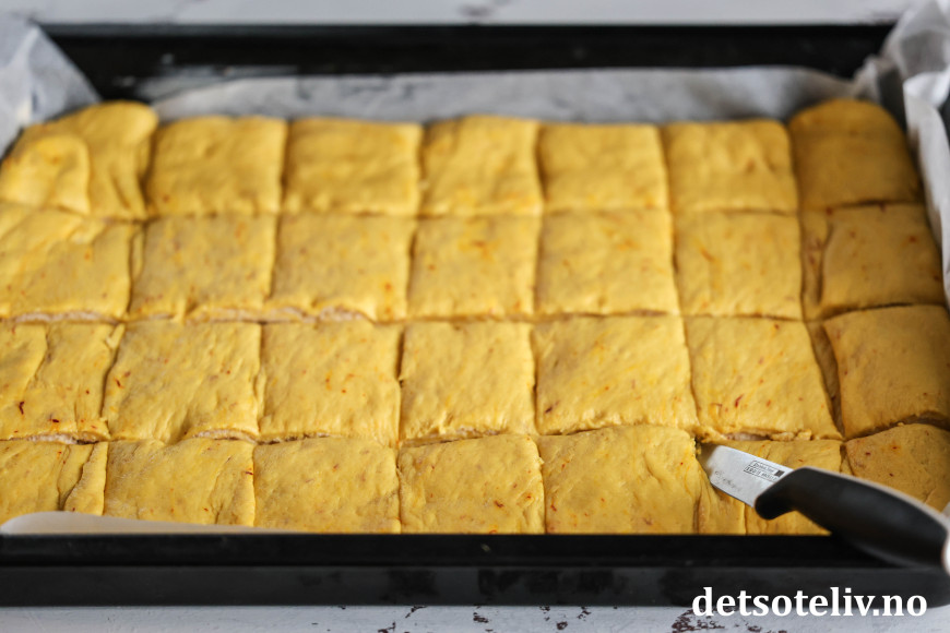 Resultatet blir firkantede, kjempesaftige Safranboller med marsipanfyll! 😋