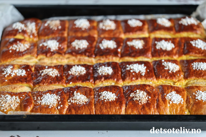 Bruk en skarp kniv til å skjær deigen opp i firkanter. Pensle over leiven med lett sammenpisket egg og dryss på perlesukker. Etterhev i ca. 40 minutter.