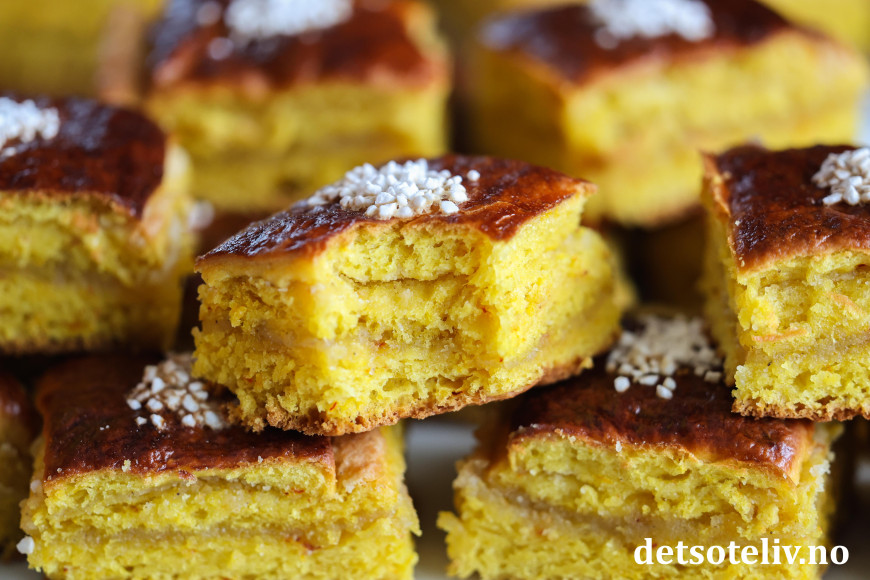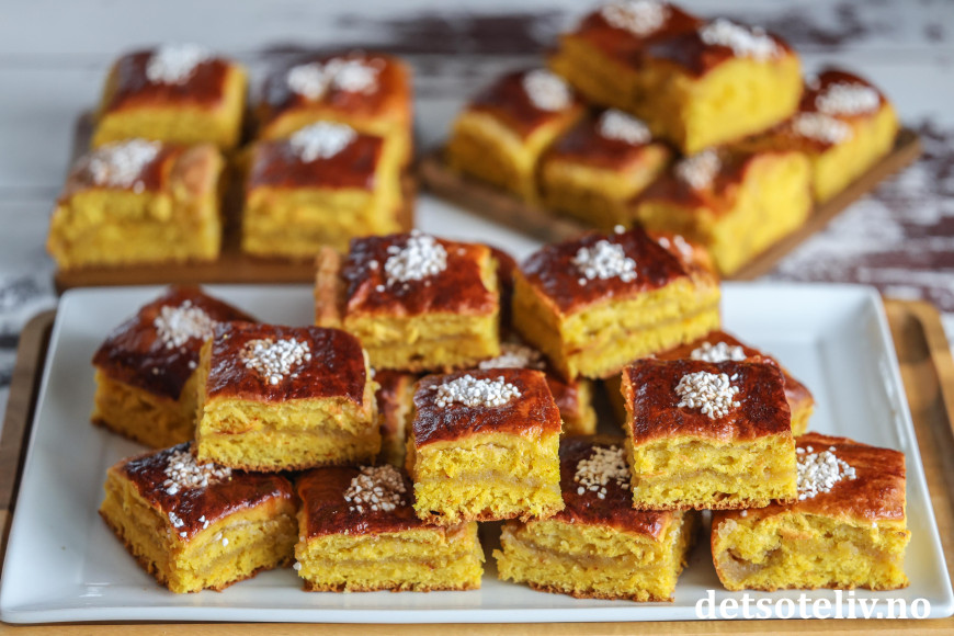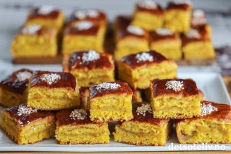 Avkjøl i langpannen før du skjærer opp kaken i firkanter.