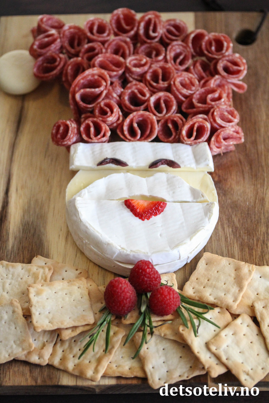 Nissen består hovedsakelig av en rund Brie, salami og kjeks. Med litt småpynt i tillegg, så har du en søt og smakfull nissemann.
