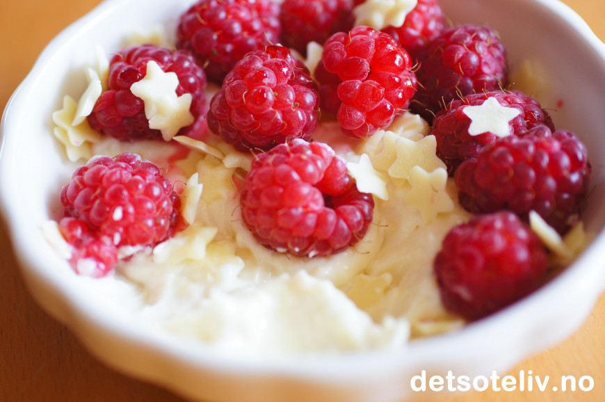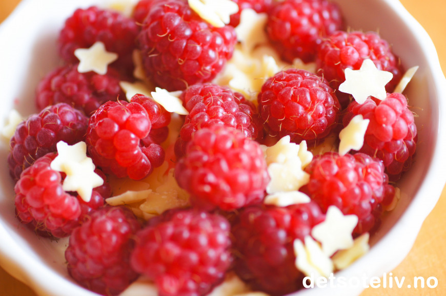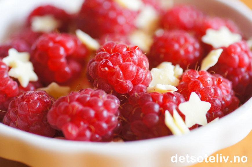 Hvit sjokolade og bringebær smaker kjempegodt sammen!