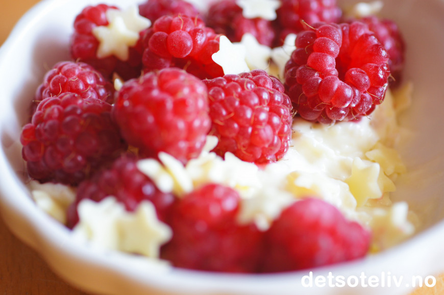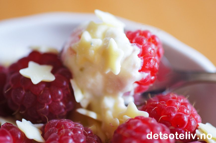 Friske sommerbringebær serveres med en nydelig og lettlaget, hvit sjokoladekrem.