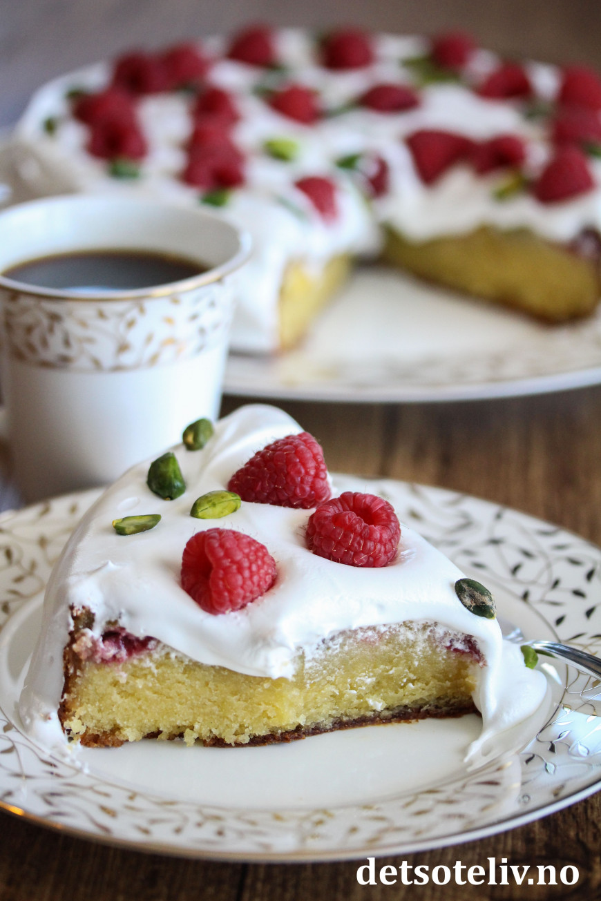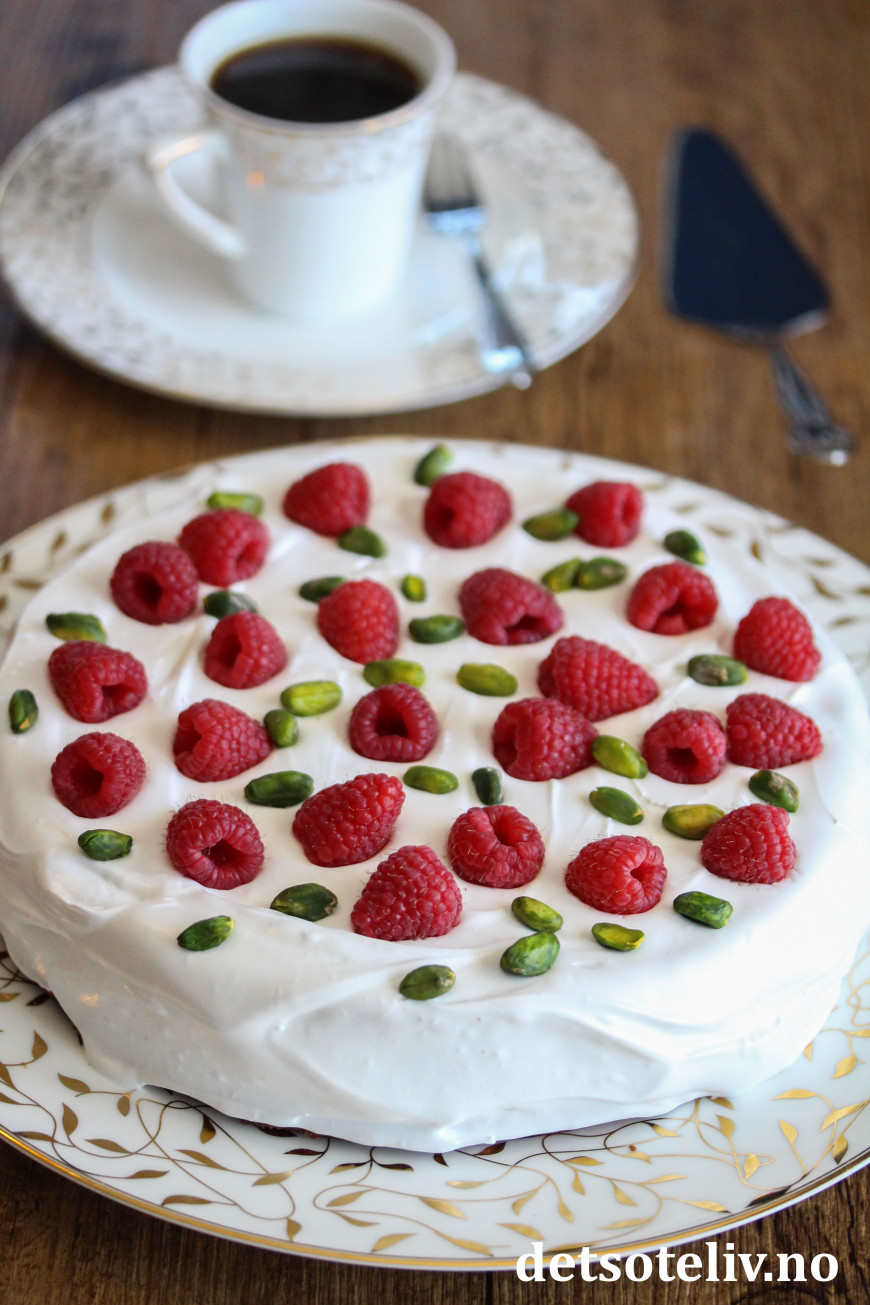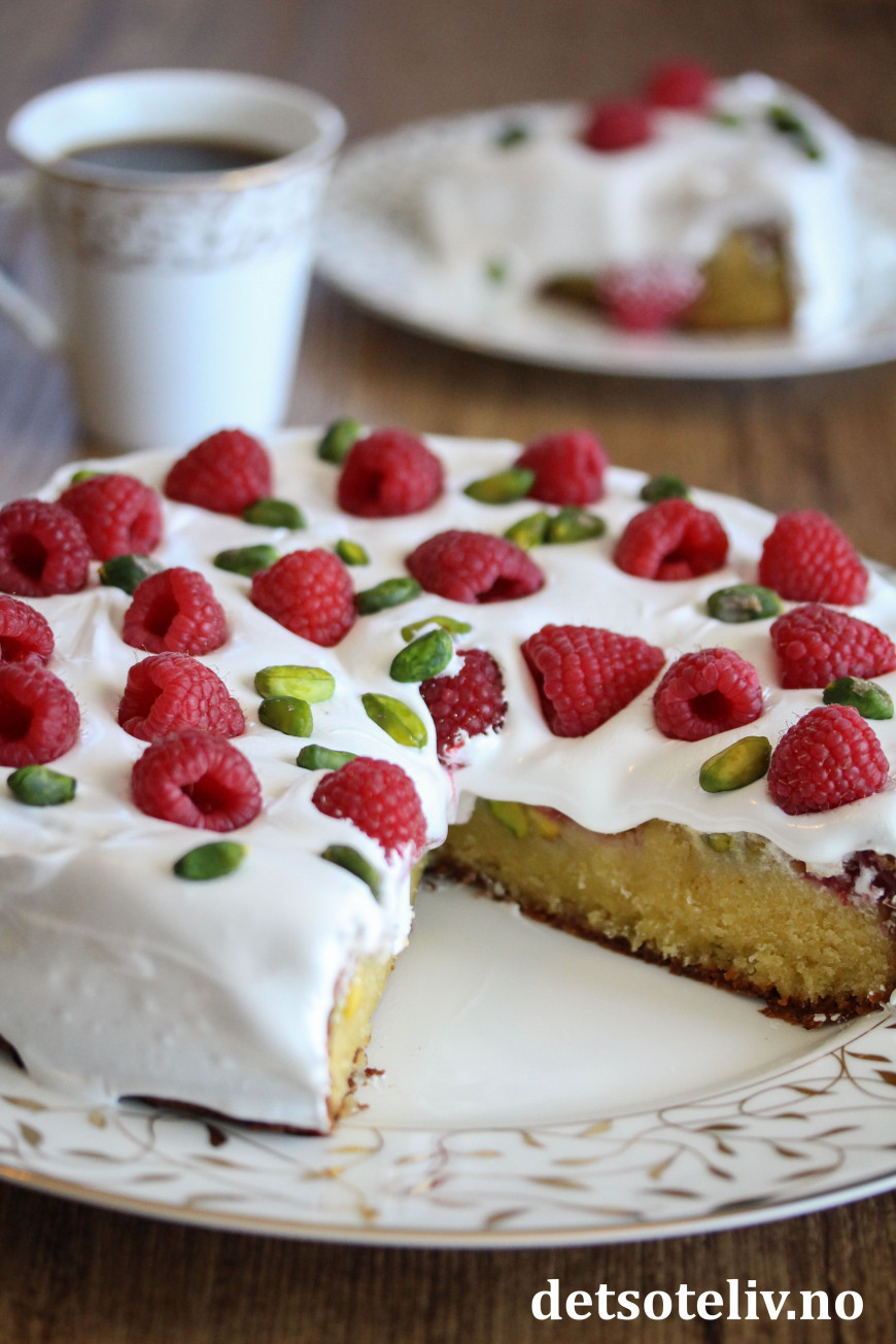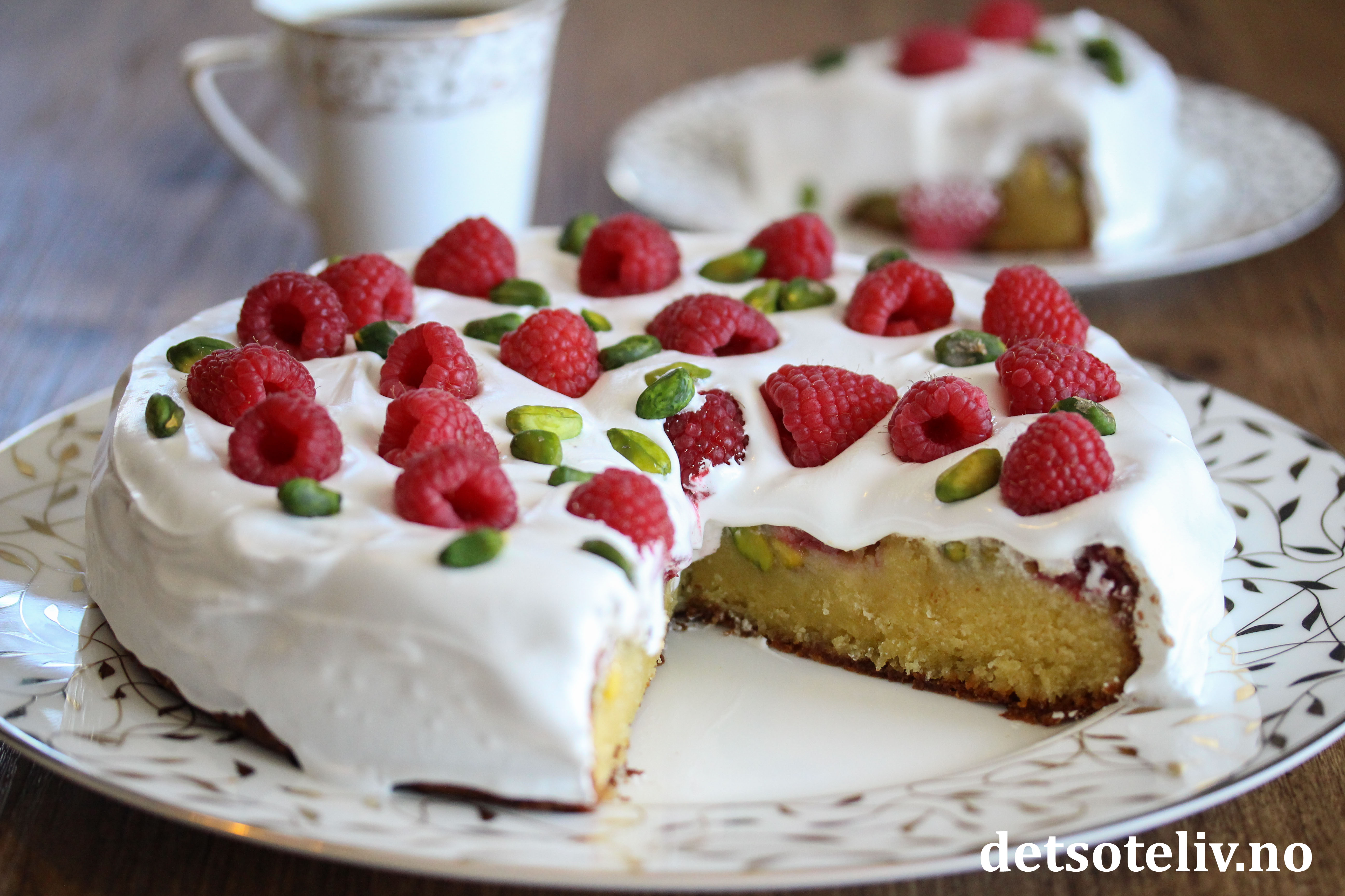 Røde bringebær og grønne pistasjnøtter gir lekker farge til den kritthvite glasuren.