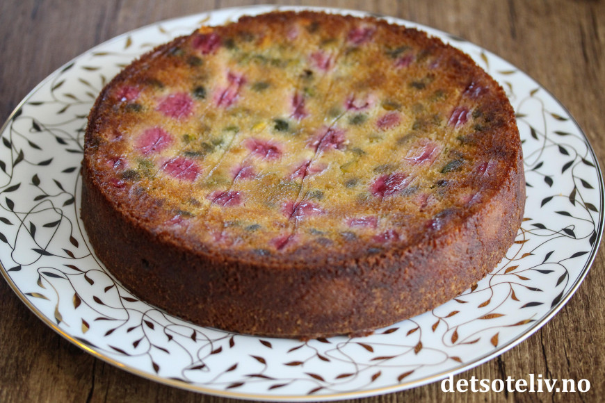 Stek kaken på rist midt i ovnen ved 170 °C i 45-60 minutter (sjekk med kakenål at kaken er helt gjennomstekt). Dekk til kaken med et stykke bakepapir på slutten av steketiden for å unngå at den blir for mørk på toppen.