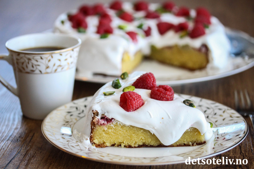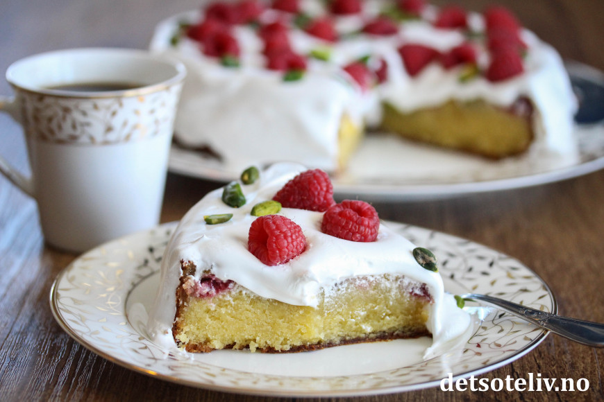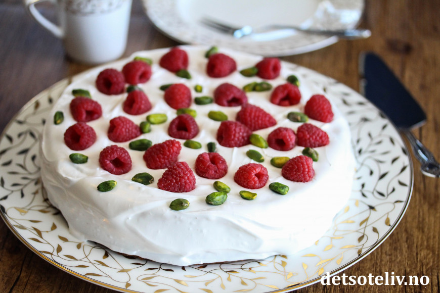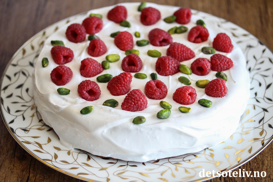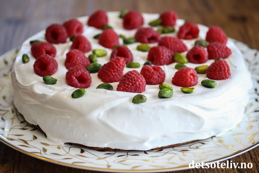 ♥ Merk at dette er en temmelig søt kake, siden mazarinbunnen inneholder marsipan og marengsglasuren også er temmelig søt. Derfor er det viktig å friske opp kaken med bringebær på toppen og inni kaken. Andre syrlige bær kan også brukes.