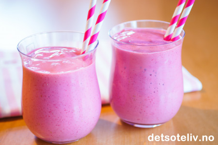 ♥ Det er en smaksak hvor tykk man liker smoothien. Dette er i utgangspunktet en nokså fyldig variant siden den lages med vaniljeyoghurt og frosne bringebær. De knuste, frosne bringebærene gir smoothien nesten litt slush-preg, som jeg synes er helt herlig! Når smoothien står en stund og bringebærene smelter, blir smoothien også tynnere i konsistens. Du kan som sagt justere tykkelse og søthetsgrad med ønsket mengde melk og sukker. Jeg bruker drøyt 1 dl melk og 2 ss sukker til denne oppskriften.