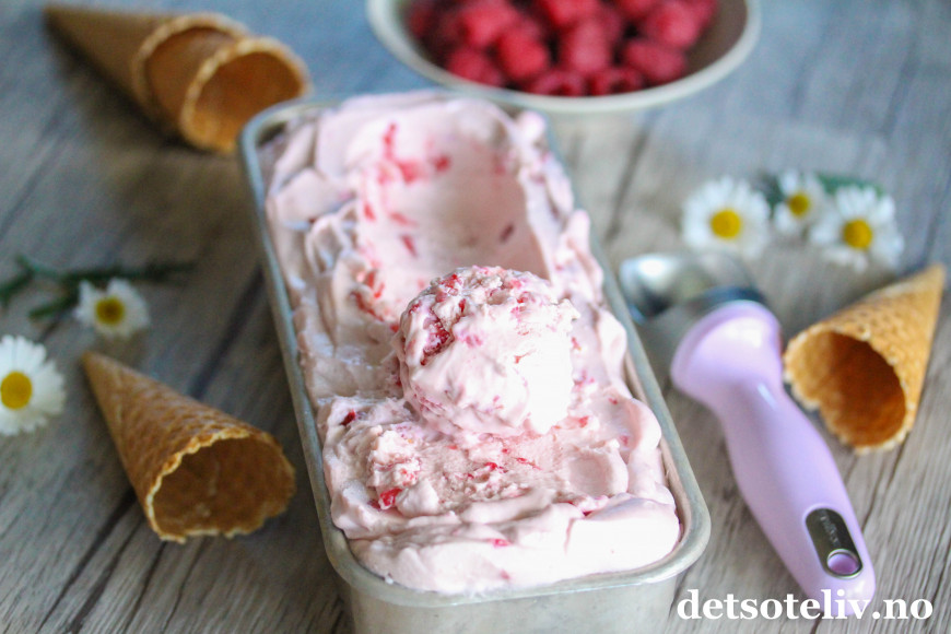 Hjemmelaget iskrem kan lages på 1-2-3 og med få ingredienser, og du trenger slett ingen iskremmaskin til denne oppskriften. Basisen for denne deilige iskremen er kun kremfløte og søtet, kondensert melk. Smaken kan varieres etter det du liker best. Her har jeg tilsatt bringebær, som gir en lyserosa iskrem som smaker nydelig!