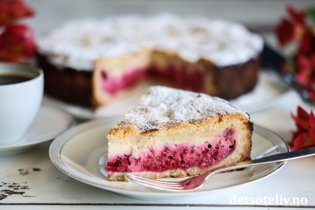 Bringebærkake med kesam er en frisk og deilig mørdeigskake med tysk opphav. Kaken har et nydelig fyll laget med kesam og bringebær. Du kan bruke både friske og frosne bringebær, så kaken kan lages året rundt.