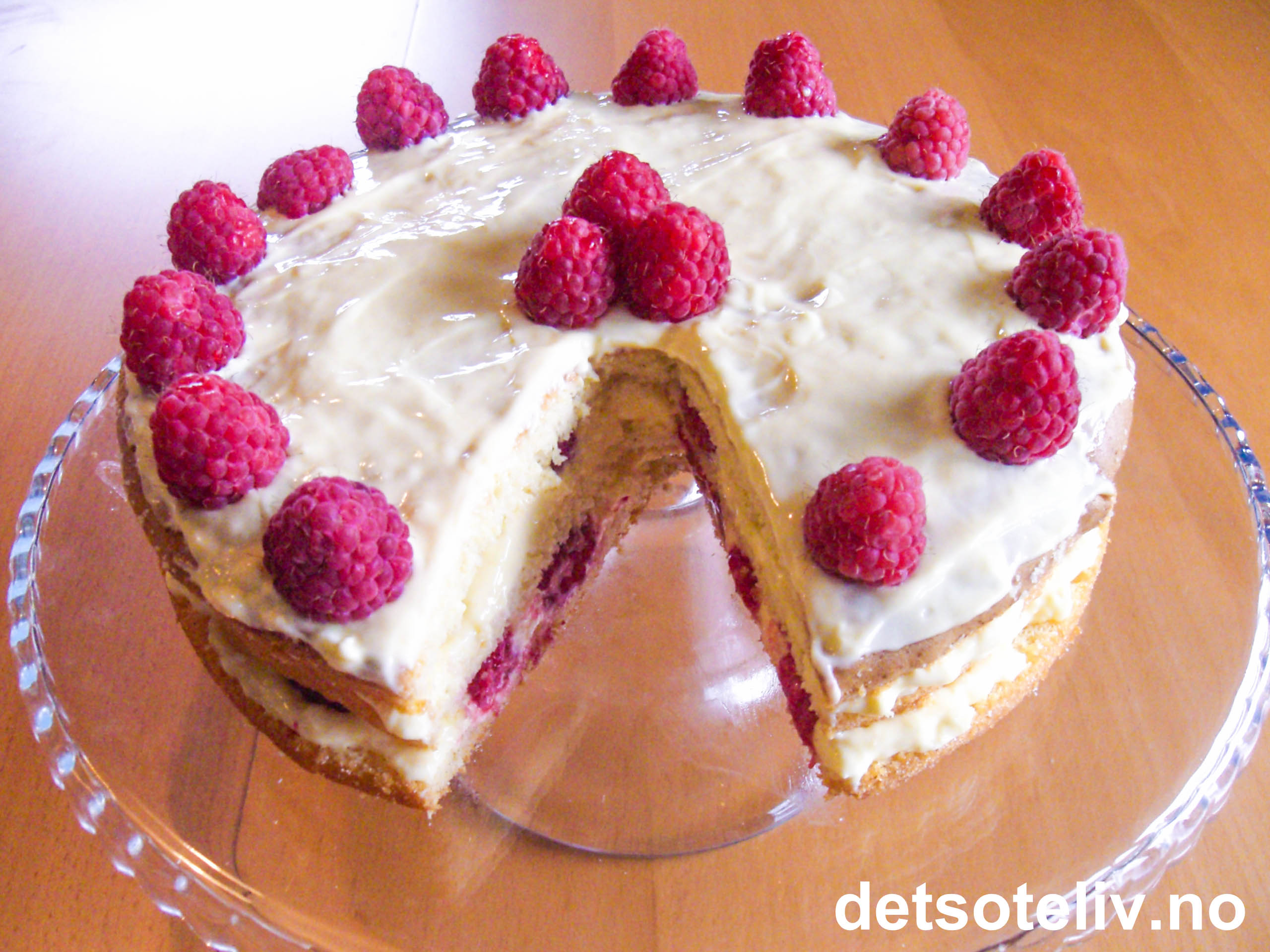 Smør resten av romkremen på toppen av kaken og pynt med bringebær.