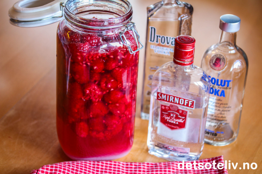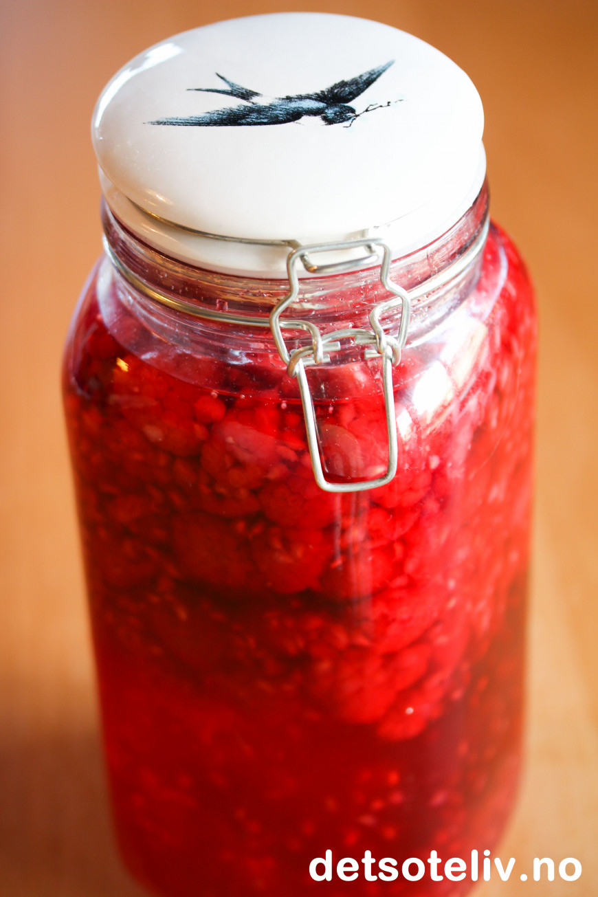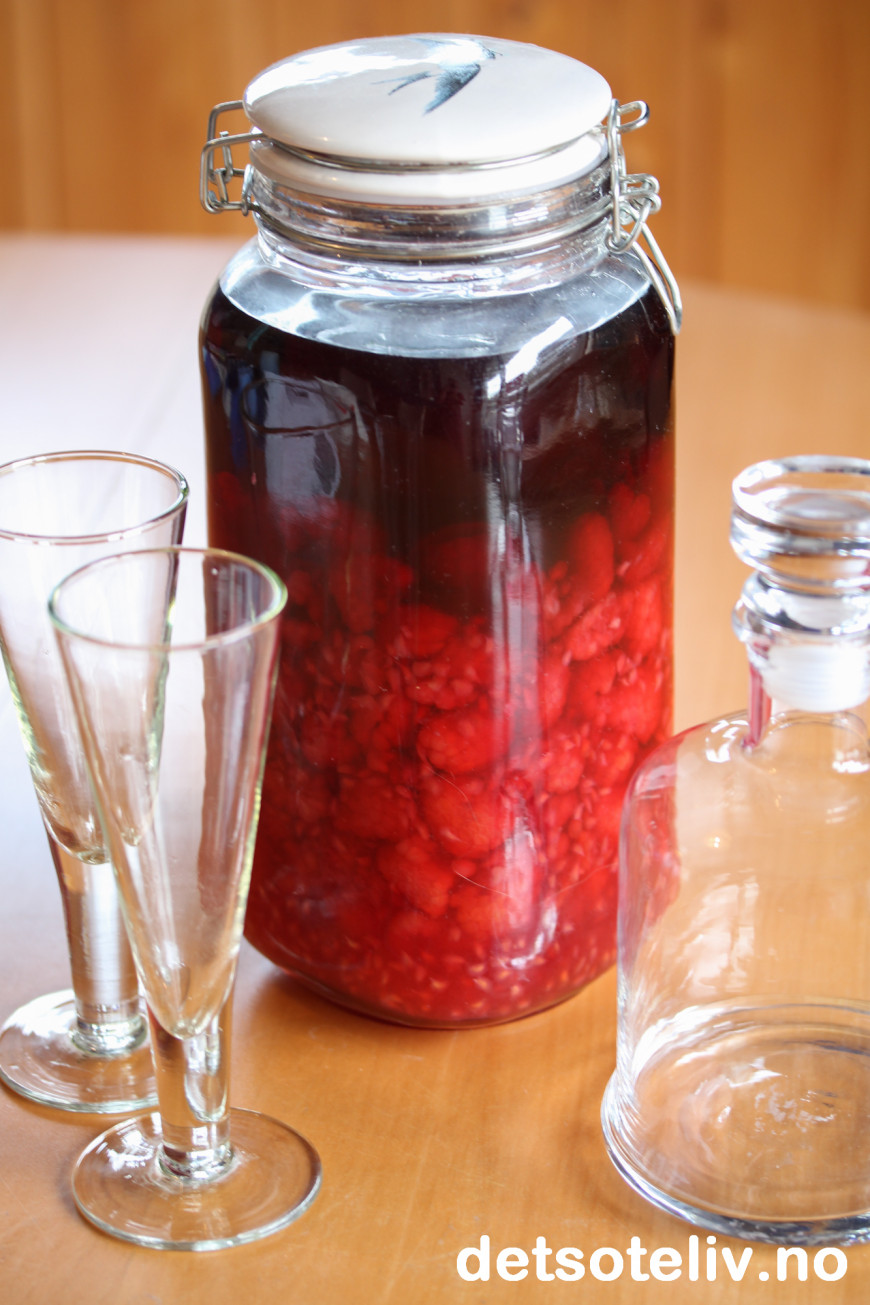♥ Bytt gjerne en del av vodkaen ut med konjakk eller brandy, det gir en litt mørkere og fyldigere bringebærlikør.