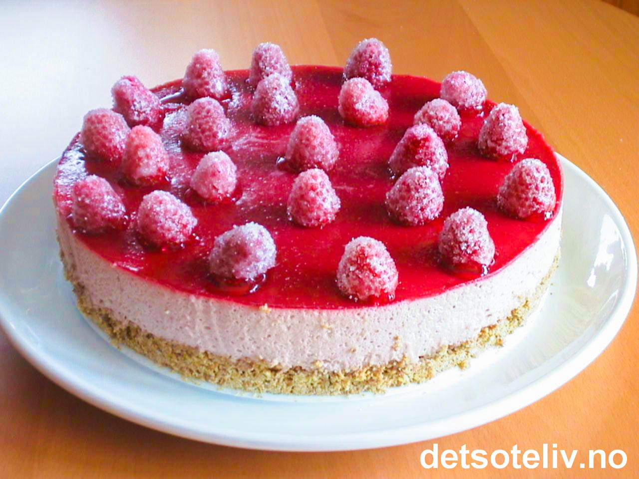 Skjær forsiktig langs kakeringen med en kniv og fjern kakeringen. Pynt kaken med sukrede bringebær.