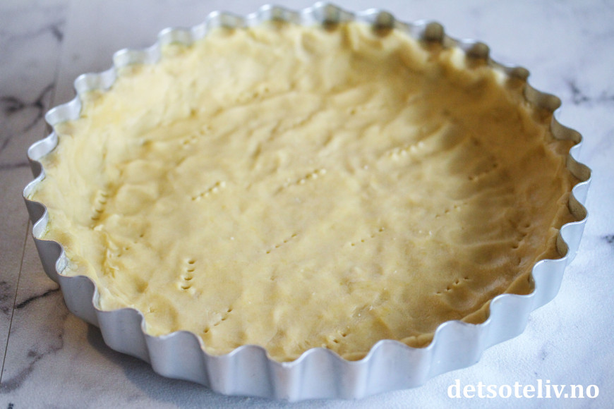 Klem deigen utover i en godt smurt paiform (26 cm i diameter) med litt høye kanter (minst 3 cm). Prikk bunnen med en gaffel. Sett formen i kjøleskapet i 30 minutter.