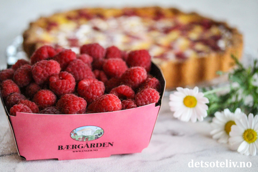 Bringebærene har jeg fått fra Bærgården, og jeg kan varmt anbefale bærene fra Bærgården! Her får du solbær, rips, stikkelsbær og bringebær av aller beste kvalitet, og gjerne økologiske bær hvis du ønsker det. Det er også mulig å kjøpe ferdiglaget saft. Bærgården holder til i Sylling i Lier kommune, en kort kjøretur utenfor Oslo. Du kan lese mer om Bærgården og ta kontakt med dem på www.enger.no eller telefon 917 96 096. Ring og bestill, og så kan du hente kasser med fantastiske bær dagen etter! Husk at bærene er på sitt beste nå!