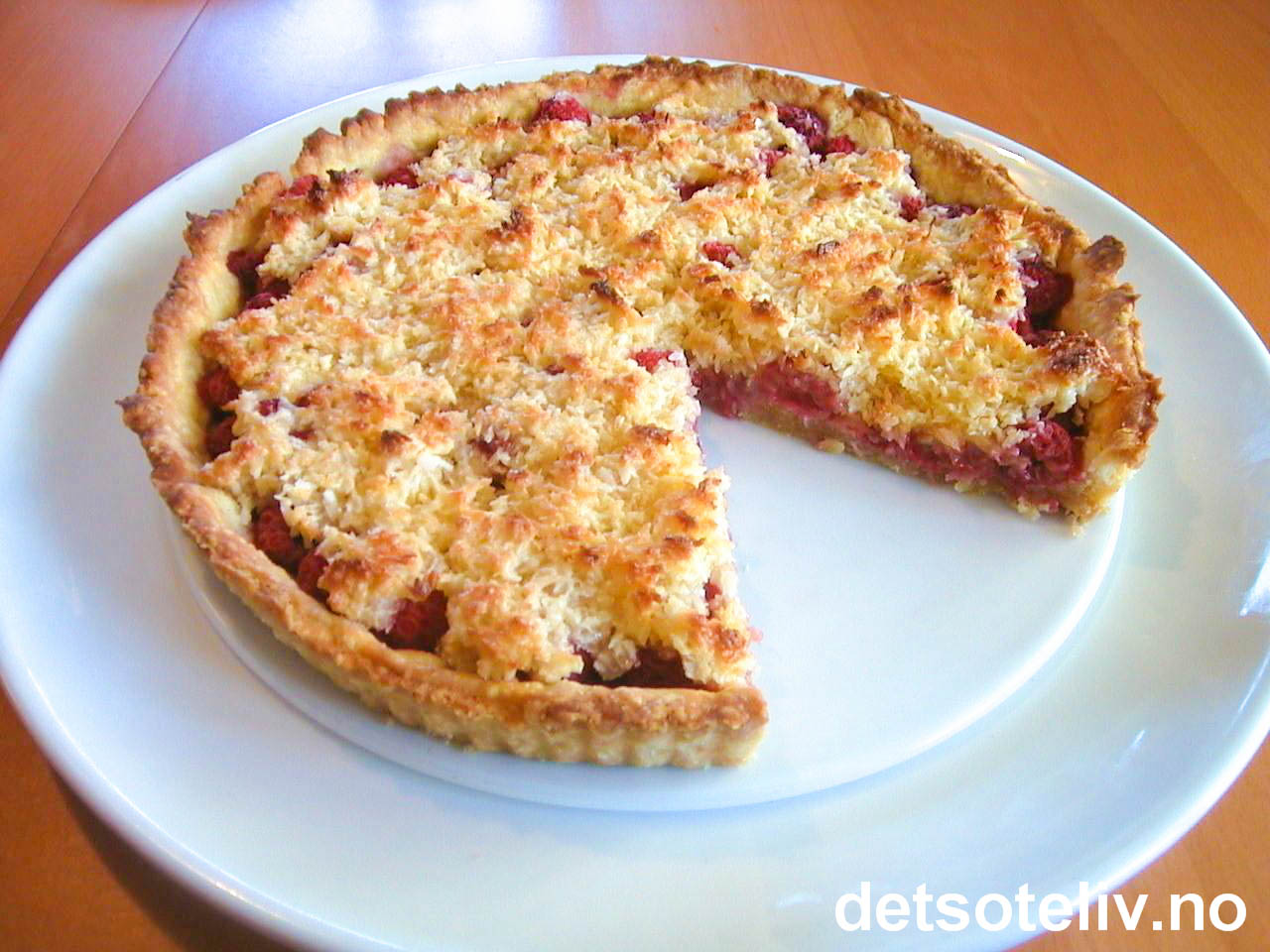 Ta kaken ut av ovnen. Dekk med bringebærene (bærene skal ikke tines). Fordel kokostoppingen over bringebærene.