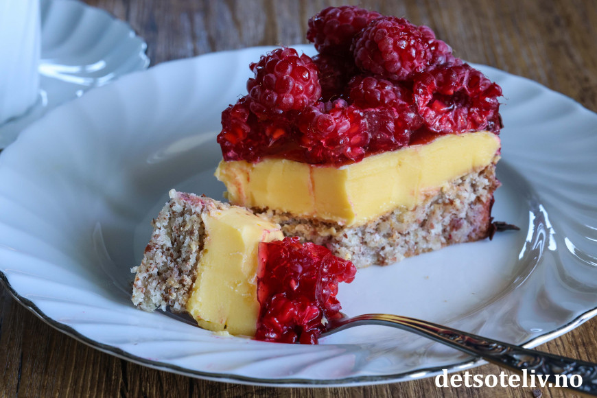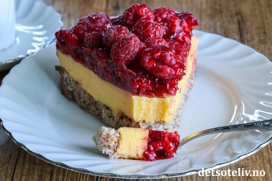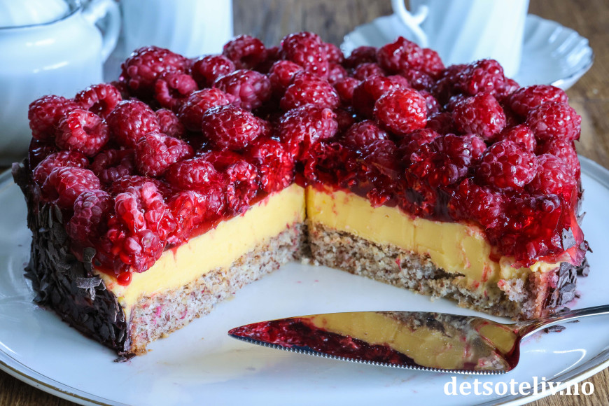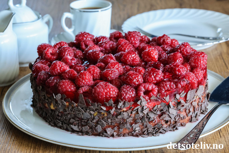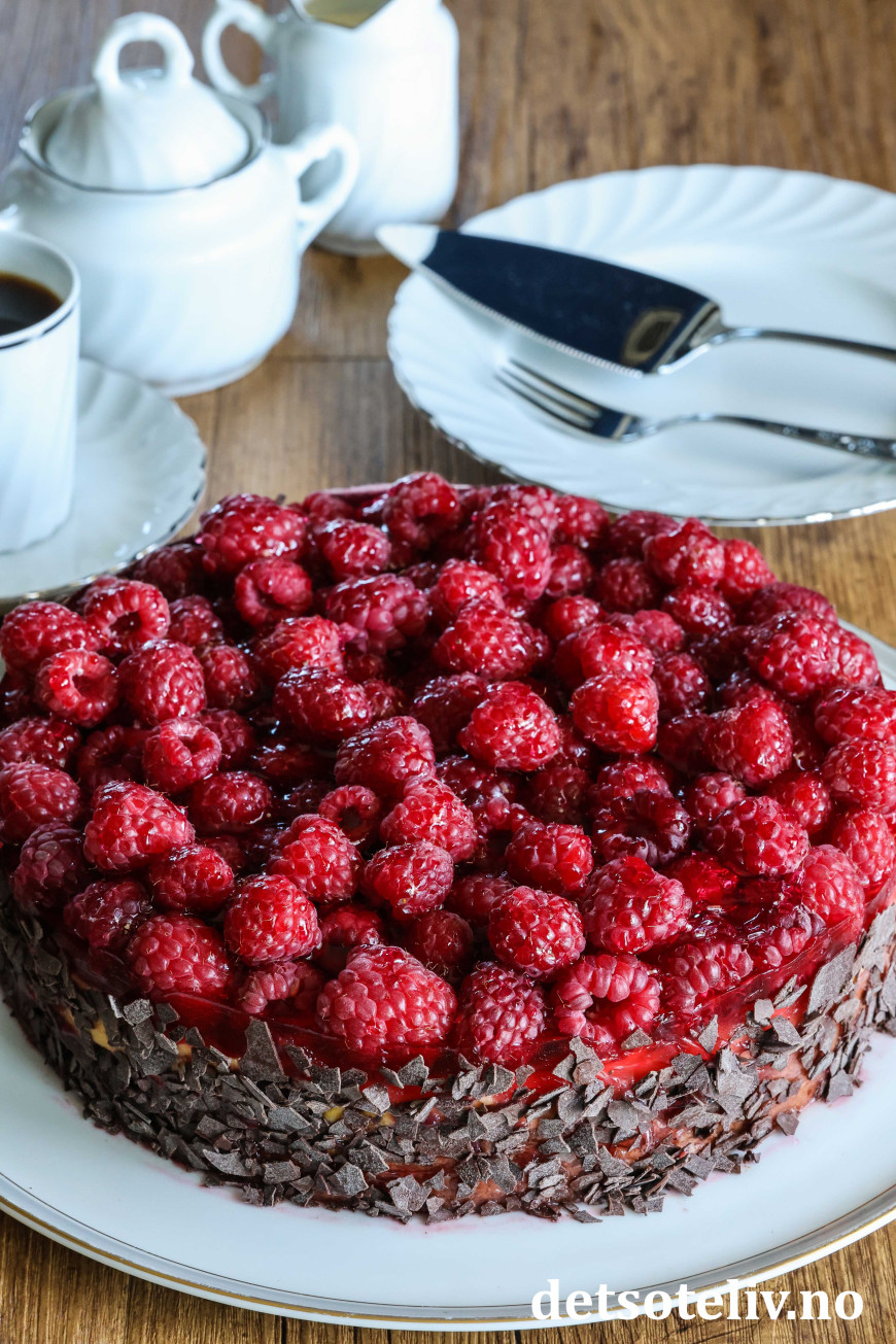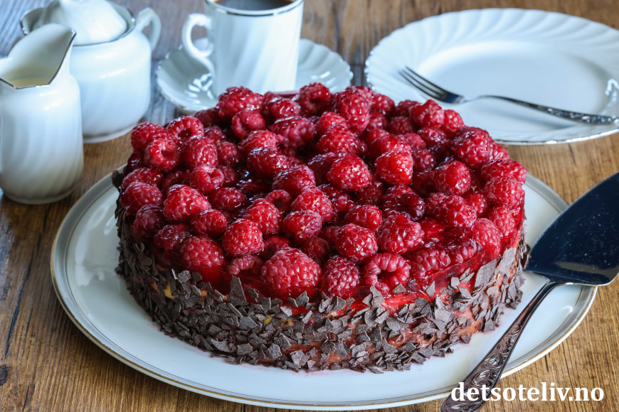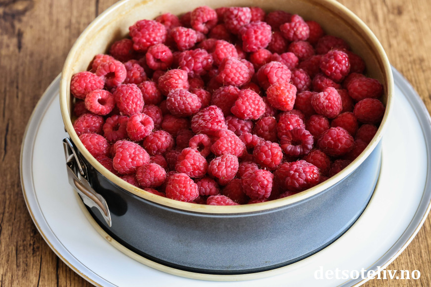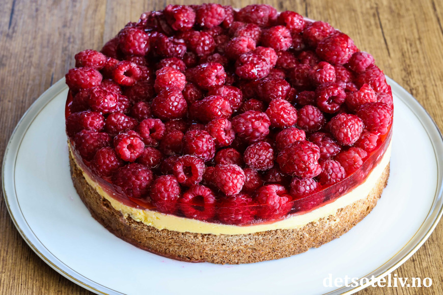 ♥ Friske bringebær blir finest på kaken, men du kan også bruke frosne. Da blir kaken litt mer rennende, men like god!