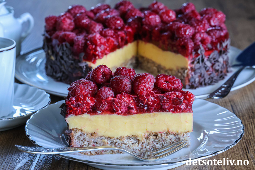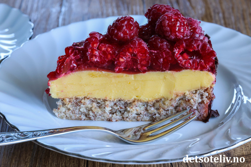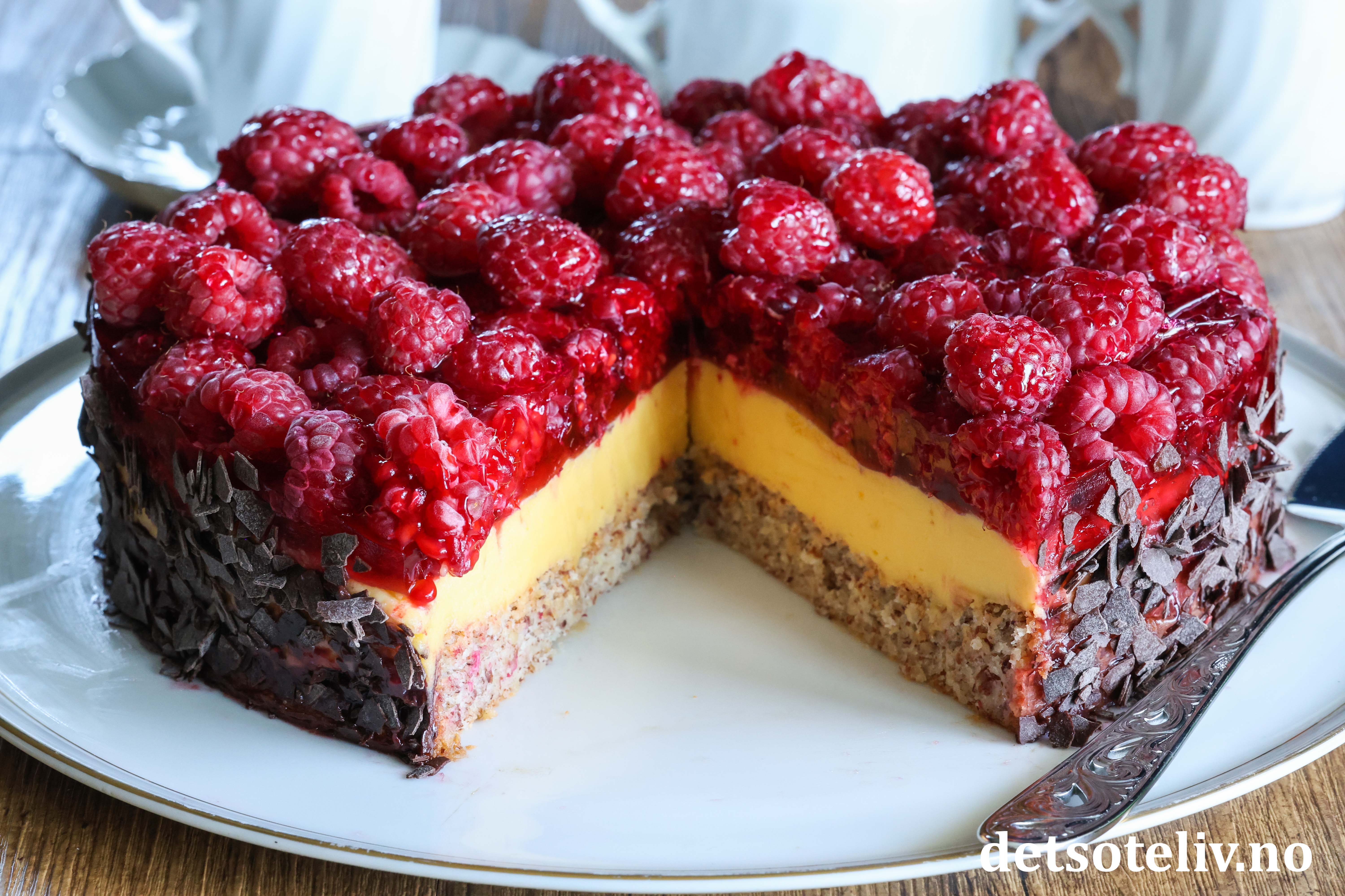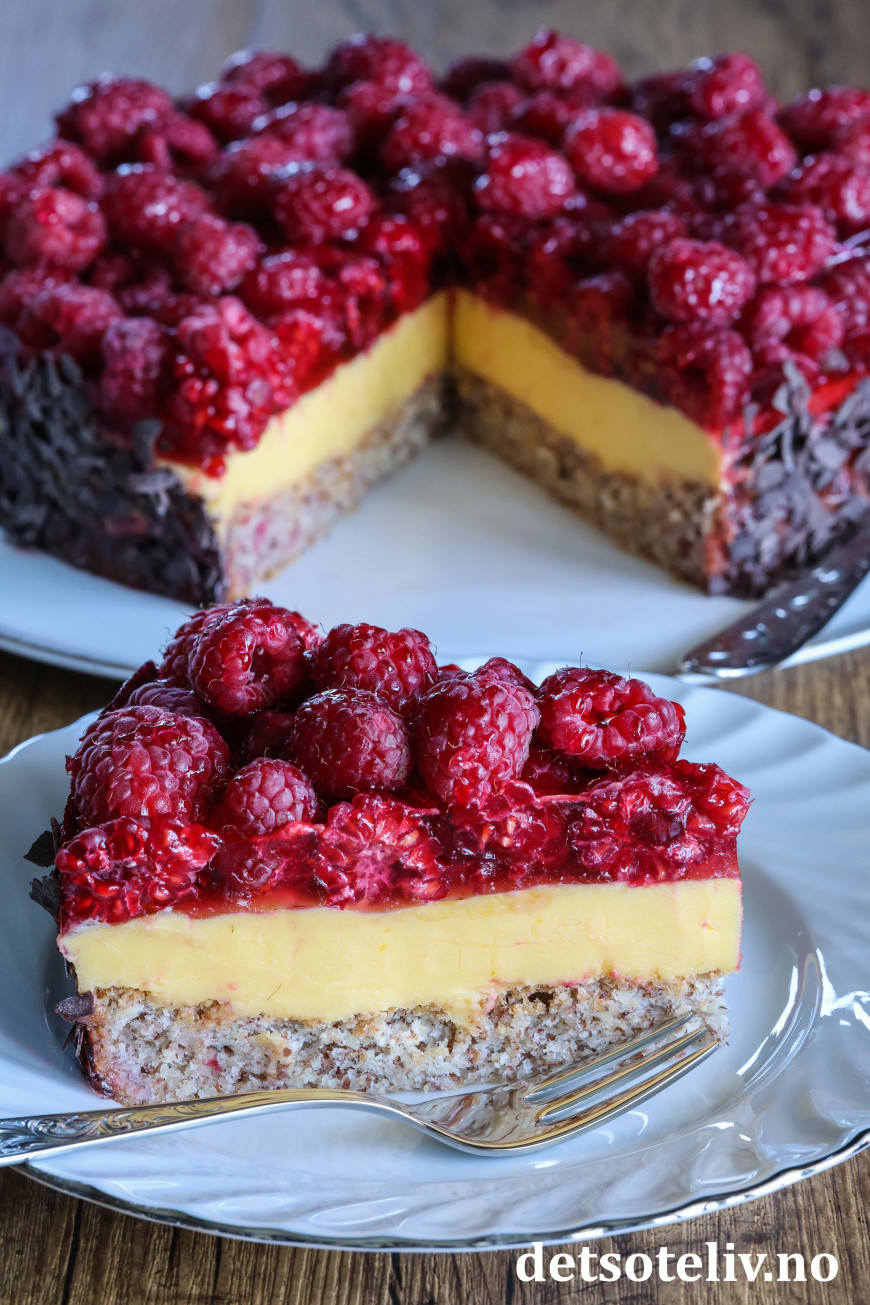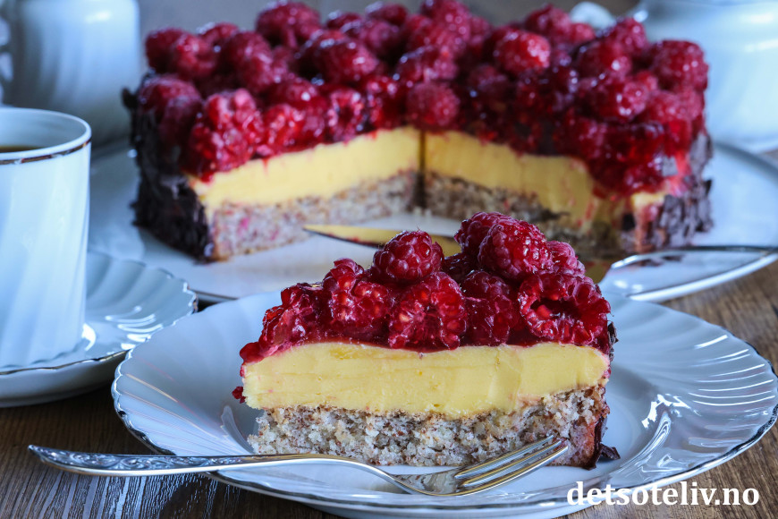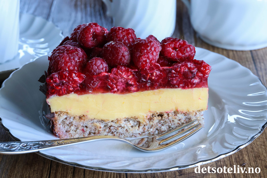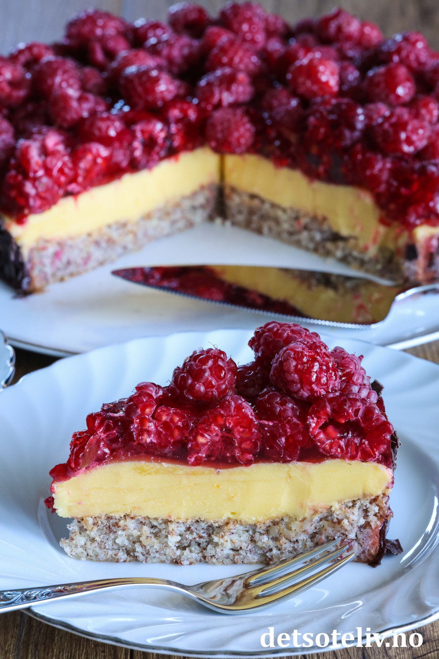 ♥ Friske bringebær blir finest på kaken, men du kan også bruke frosne. Da blir kaken litt mer rennende, men like god!