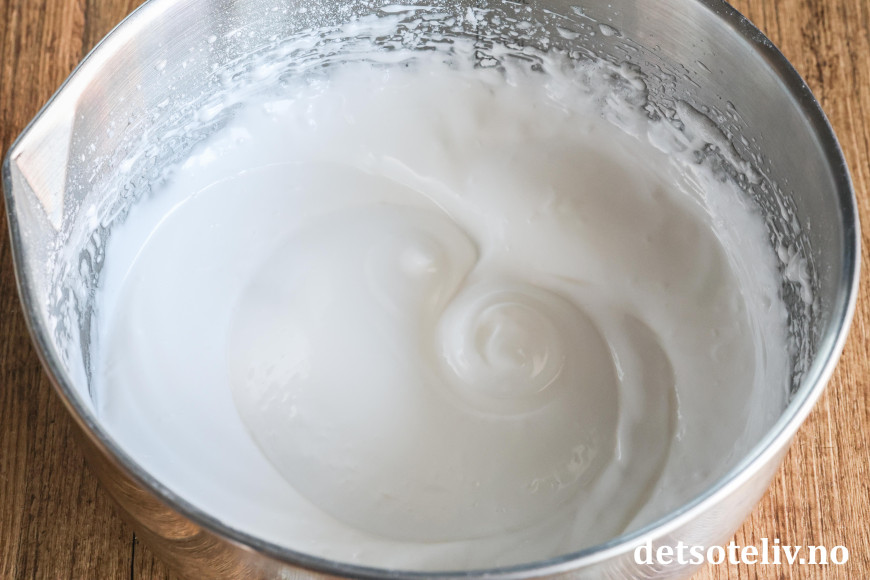 Pisk eggehvitene stive. Ha i melis og pisk videre til marengs.