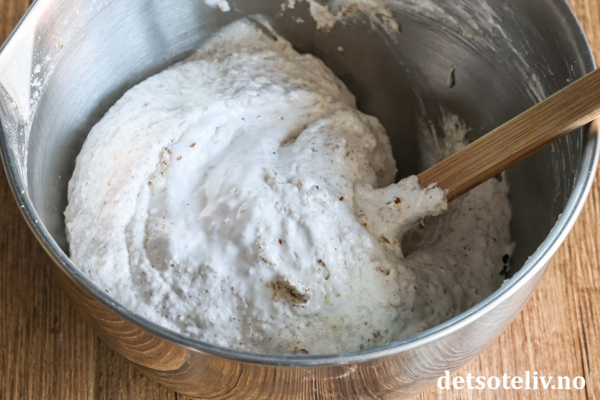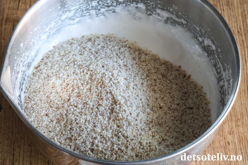 Vend dette deretter sammen med marengsen så du får en tykk mandeldeig.