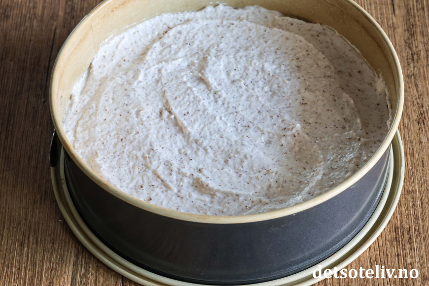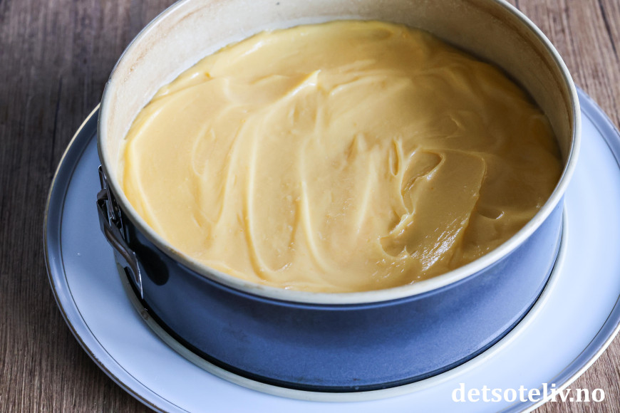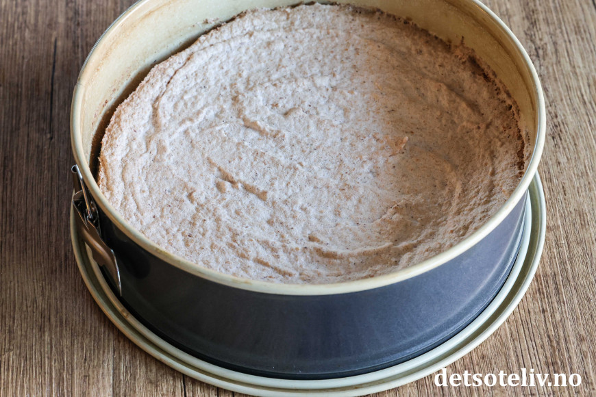 Ha deigen i en rund kakeform (24 cm i diameter) med bakepapir i bunnen.