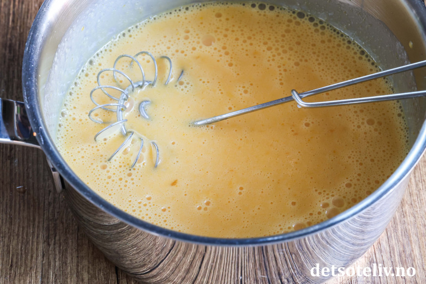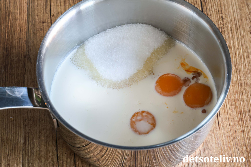 Bland eggeplommer, kremfløte, sukker og vaniljesukker i en liten kjele.