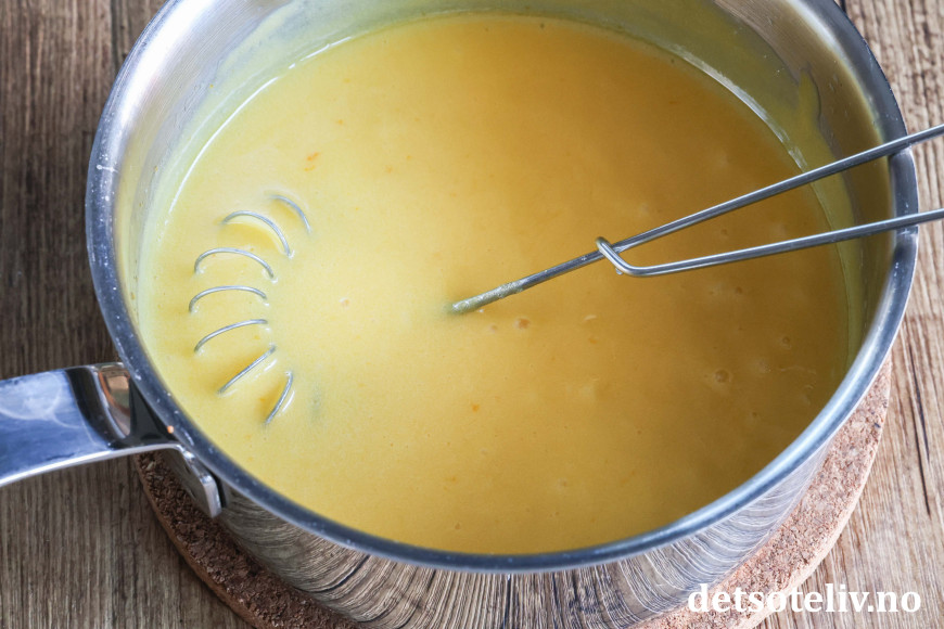 ♥ Pass nøye på at kremen ikke setter seg fast i bunnen på kjelen, eller blir brent under kokingen. Brune flekker i kremen er ikke særlig pent. Merk at kremen må koke en stund mens du visper (ca. 30 sekunder), slik at den blir merkbart tykkere i konsistensen.
