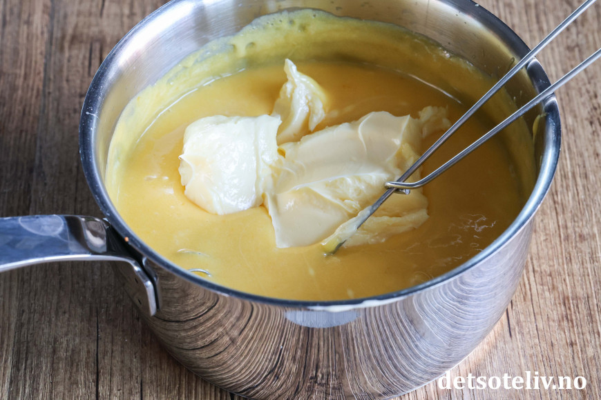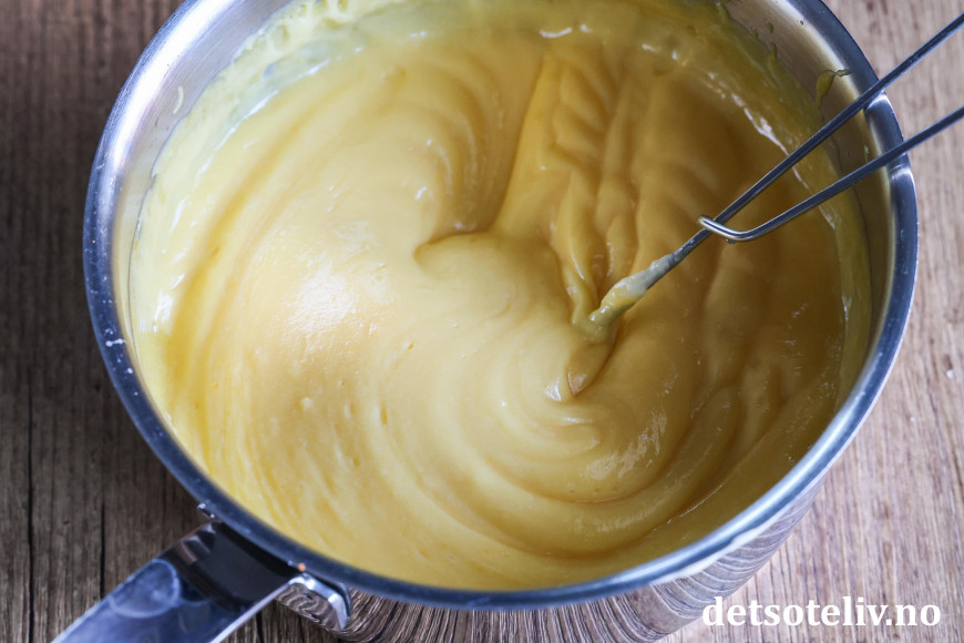 ♥ For å unngå at den gule kremen blir for tynn i konsistensen, er det viktig at du avkjøler den kokte kremen til romtemperatur før du pisker inn mykt smør i klatter. Den gule kremen vil tykne ytterligere når kaken står i kjøleskapet.