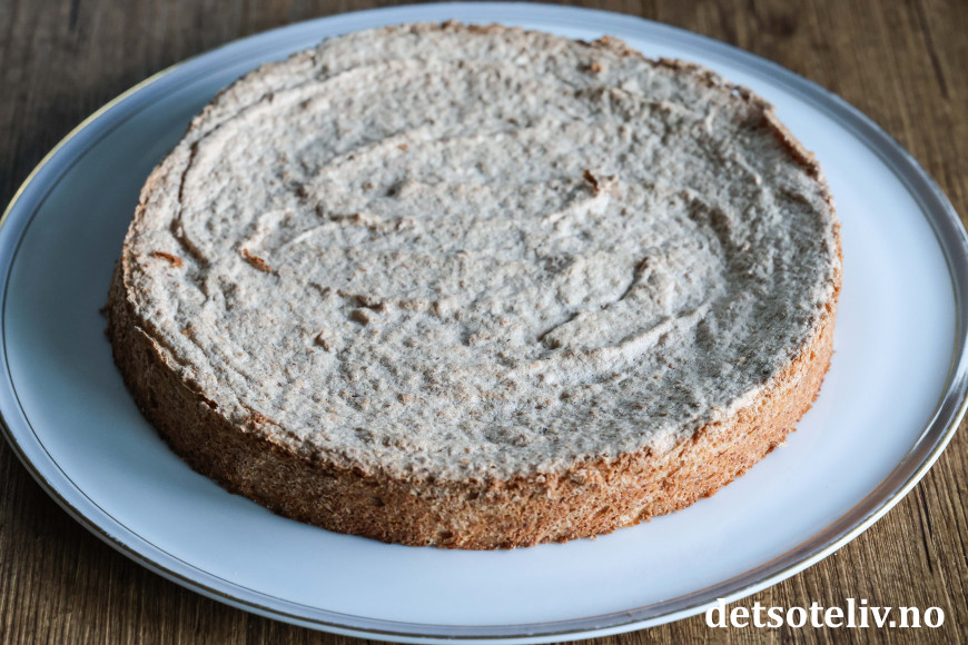 Ha deigen i en rund kakeform (24 cm i diameter) med bakepapir i bunnen. Stek kaken midt i ovnen ved 175°C i 30 minutter. Avkjøl kaken helt i formen.