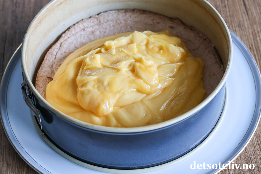 Fordel kremen over kaken i formen. Sett fatet i kjøleskapet til kremen har stivnet.