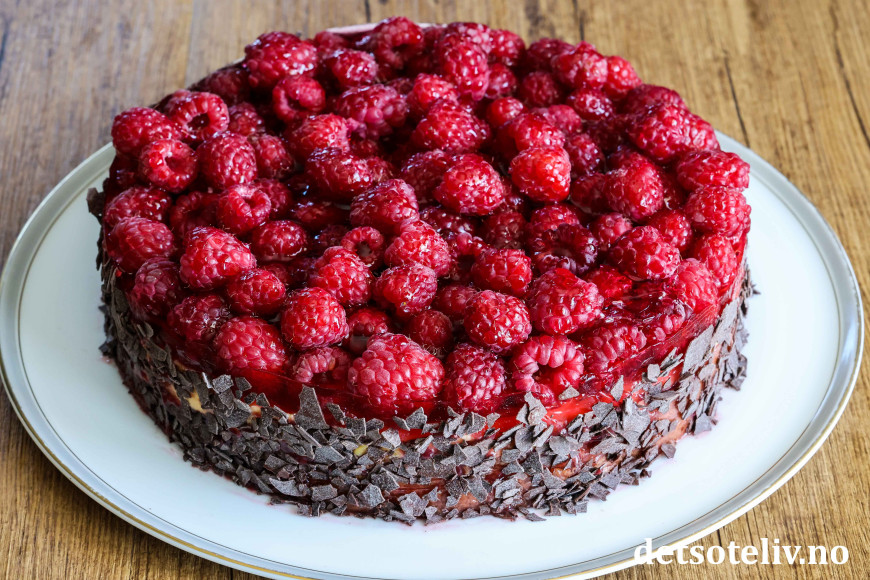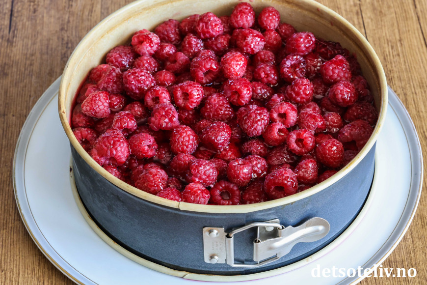 Ha geléen forsiktig over bringebærene og sett kaken i kjøleskapet til geléen har stivnet.