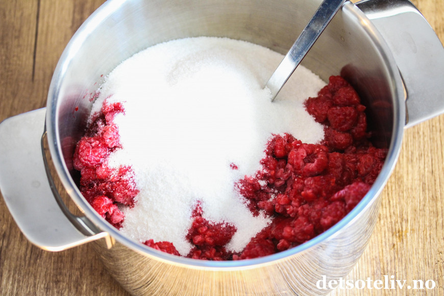 Ha rensede bringebær i en kjele. Tilsett sukkeret. La dette eventuelt stå i 30 minutter, slik at bringebærene begynner å safte seg.