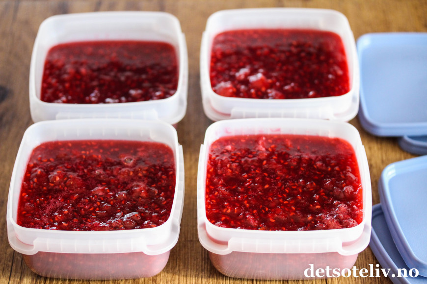 ♥ Syltetøyet has på varme, steriliserte glass og oppbevares mørk og kjølig. Jeg pleier å ha på glass det jeg bruker i løpet av de nærmeste dagene og oppbevarer dette i kjøleskapet. Resten har jeg på plastbokser som jeg putter i fryseren.