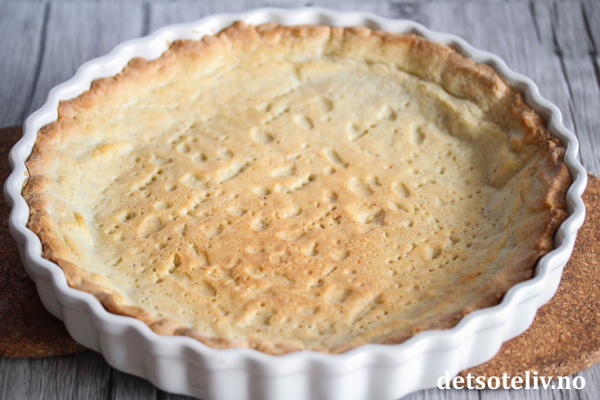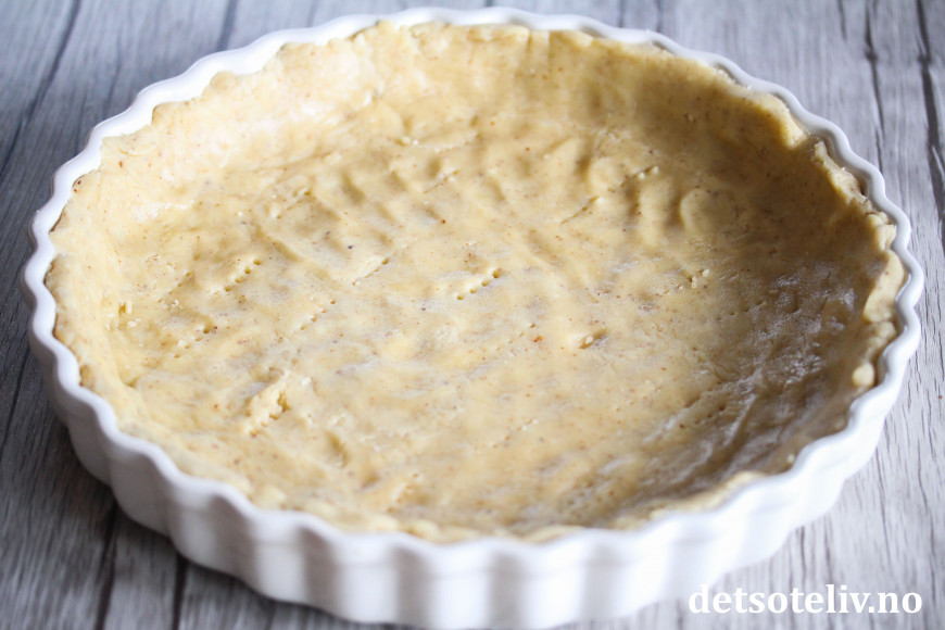 Klem deigen utover i en godt smurt terteform (28 cm i diameter). Prikk bunnen med en gaffel.
