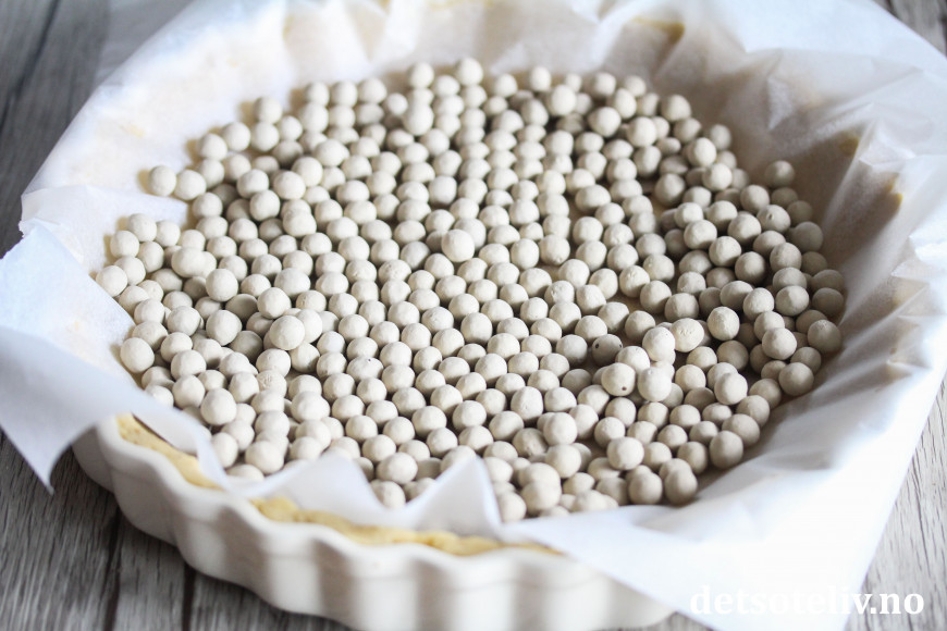 Legg bakepapir på deigen og fyll opp med keramiske bakekuler (tørkede erter eller bønner kan også brukes).