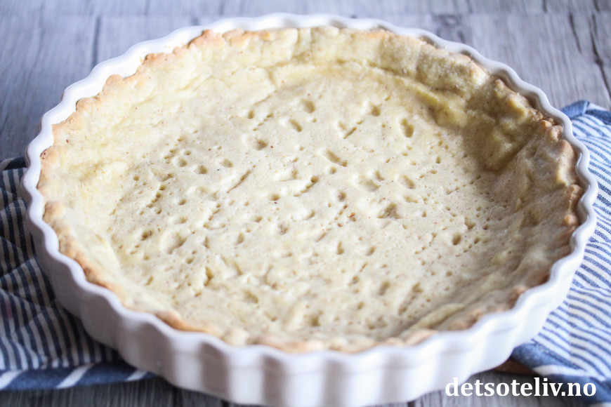 Legg bakepapir på deigen og fyll opp med keramiske bakekuler (tørkede erter eller bønner kan også brukes). Forstek bunnen midt i ovnen ved 200 °C i 15 minutter. Fjern forsiktig bakepapiret med bakekulene (eller ertene/bønnene) og stek bunnen i 5 minutter til. Avkjøl.