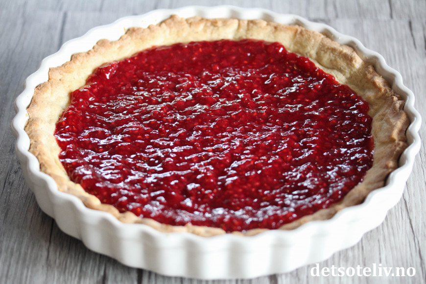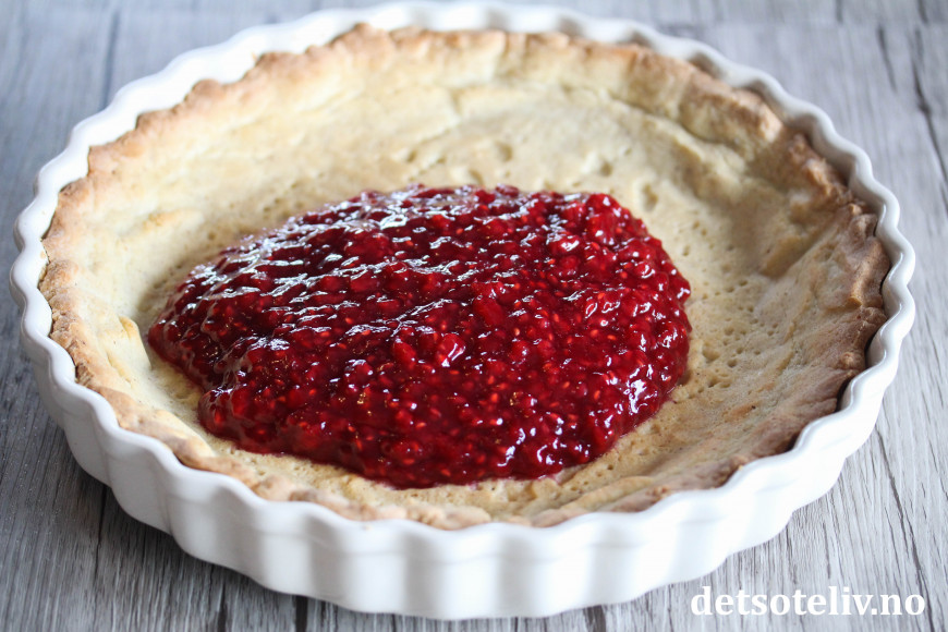 Fyll den avkjølte tertebunnen med hjemmelaget bringebærsyltetøy.