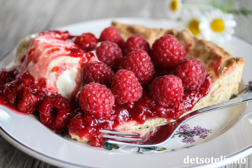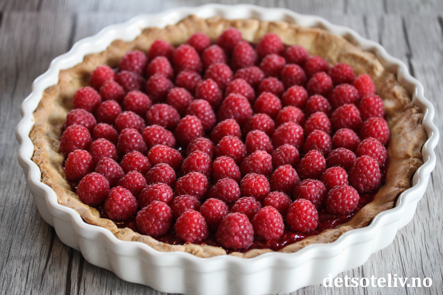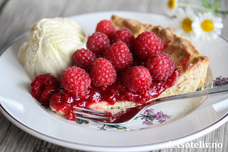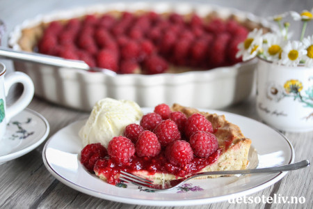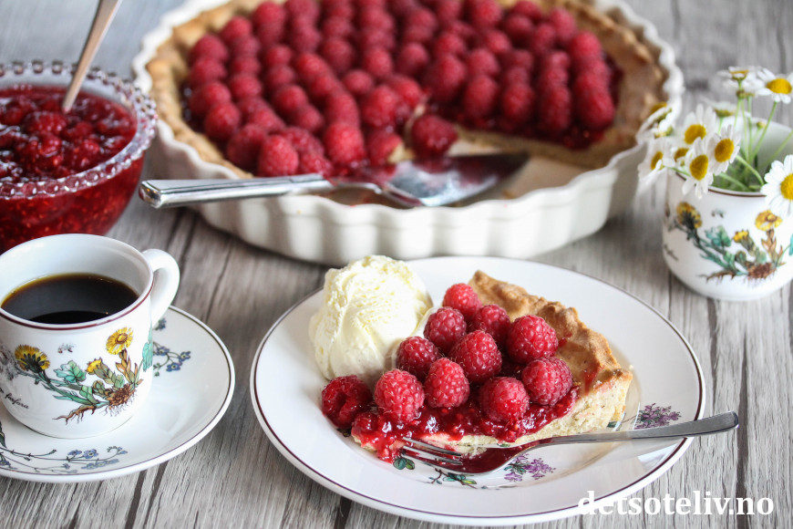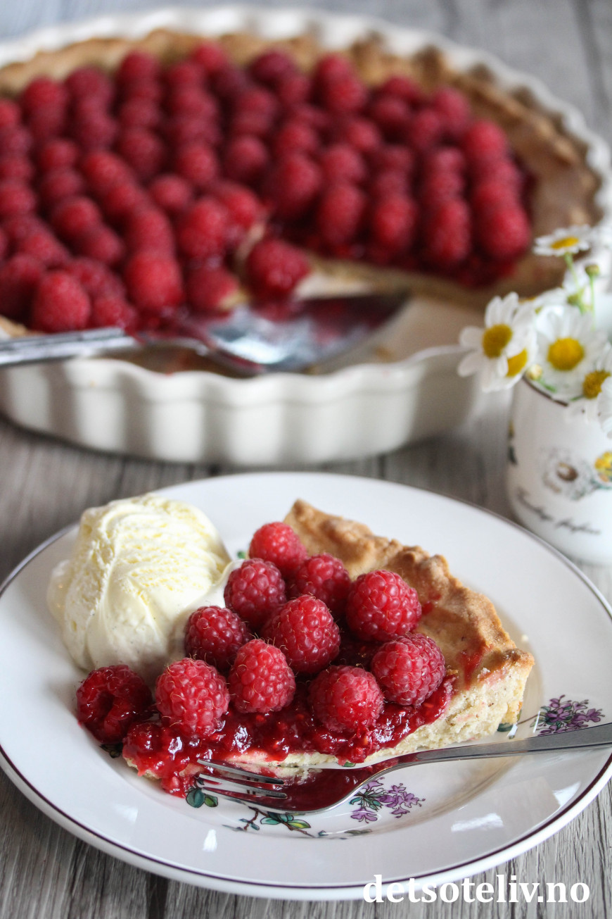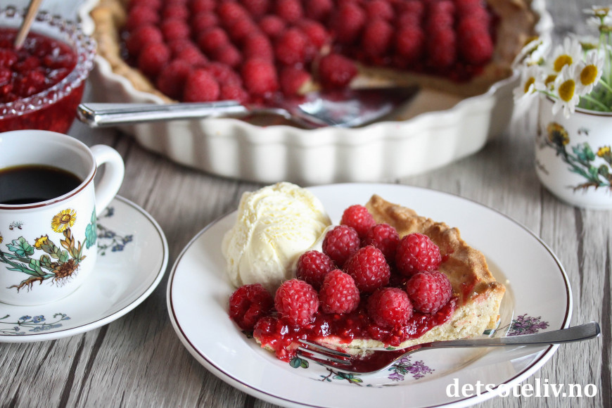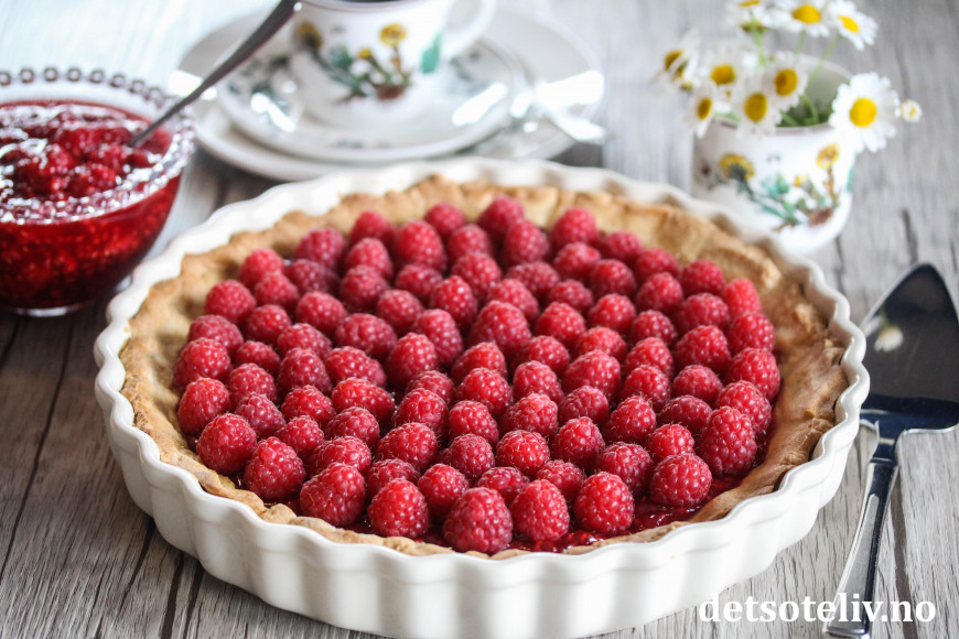 ♥ Bringebærterten er også nydelig servering sammen med hjemmelaget vaniljesaus.