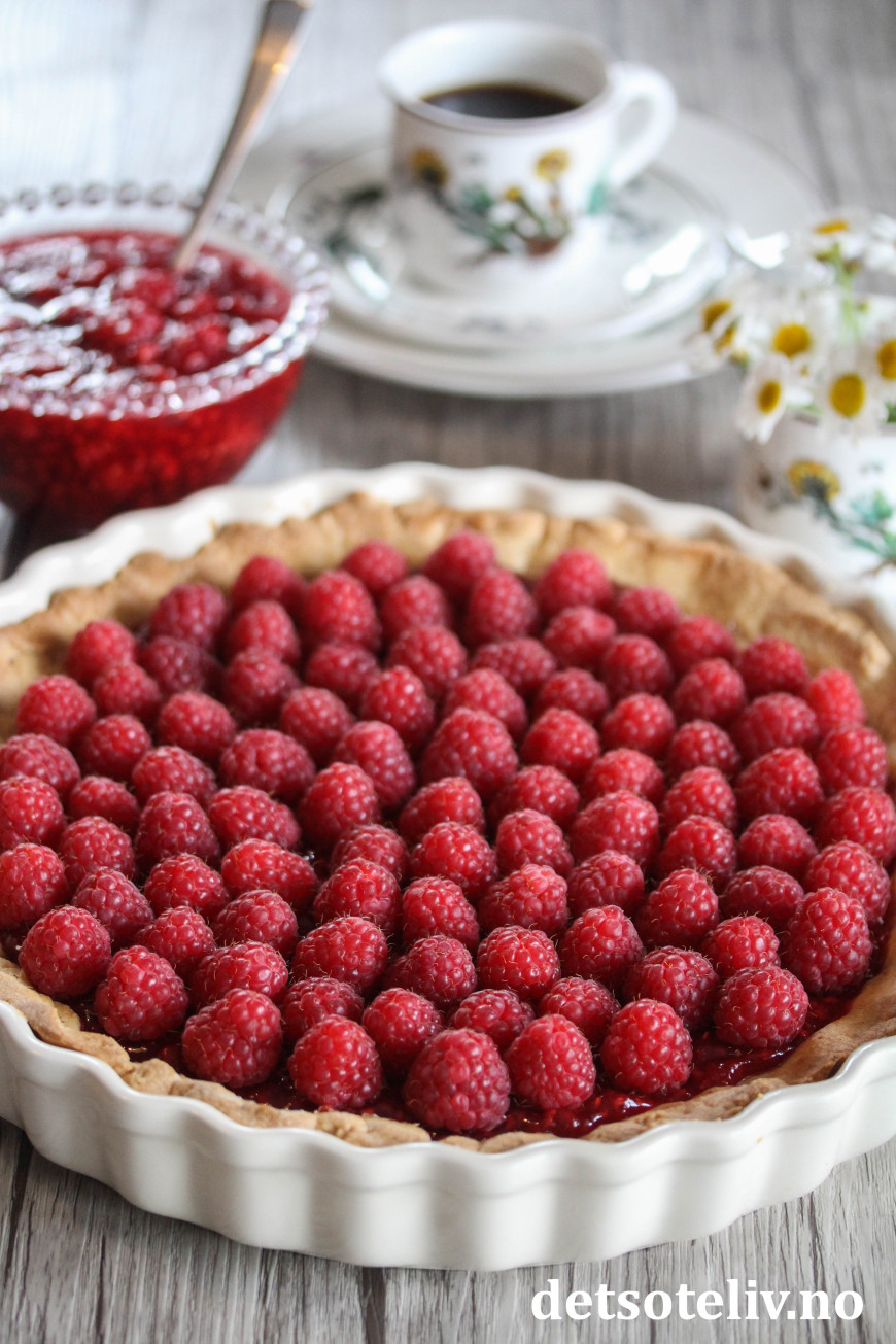 Terten består av en mørdeigsbunn med mandler, som fylles med hjemmelaget bringebærsyltetøy og friske bringebær.