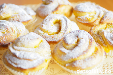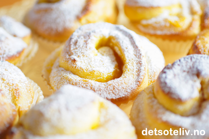♥ Disse bollene blir litt klissete på undersiden på grunn av sitronkremen, så det er lurt å sette bollene i muffinsformer før steking.