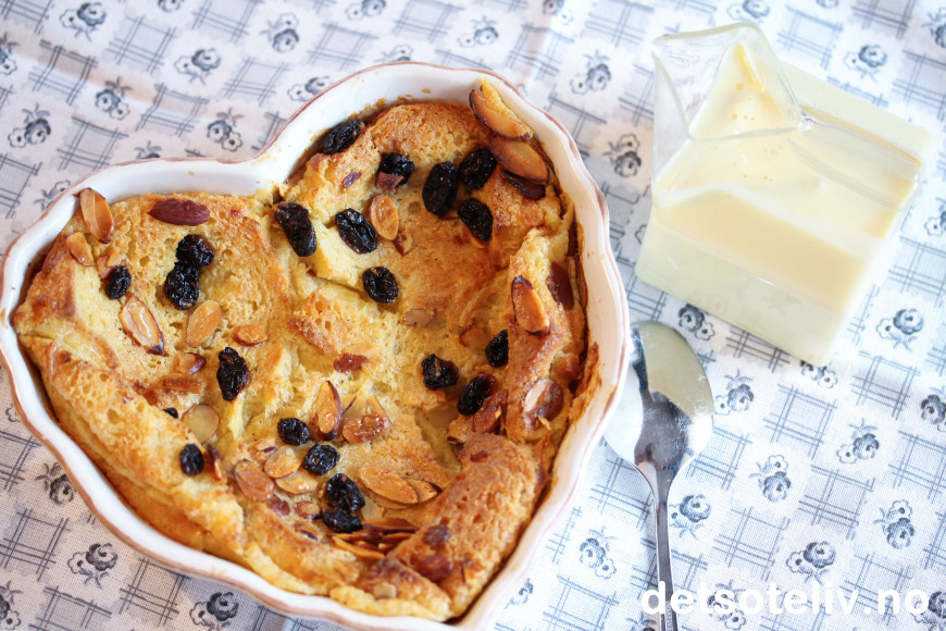 Se også oppskrift på "Brødpudding med pasjonsfrukt", "Brødpudding med tørket frukt", "Brødpudding med rom og rosiner" og "Brødpudding med sjokolade".