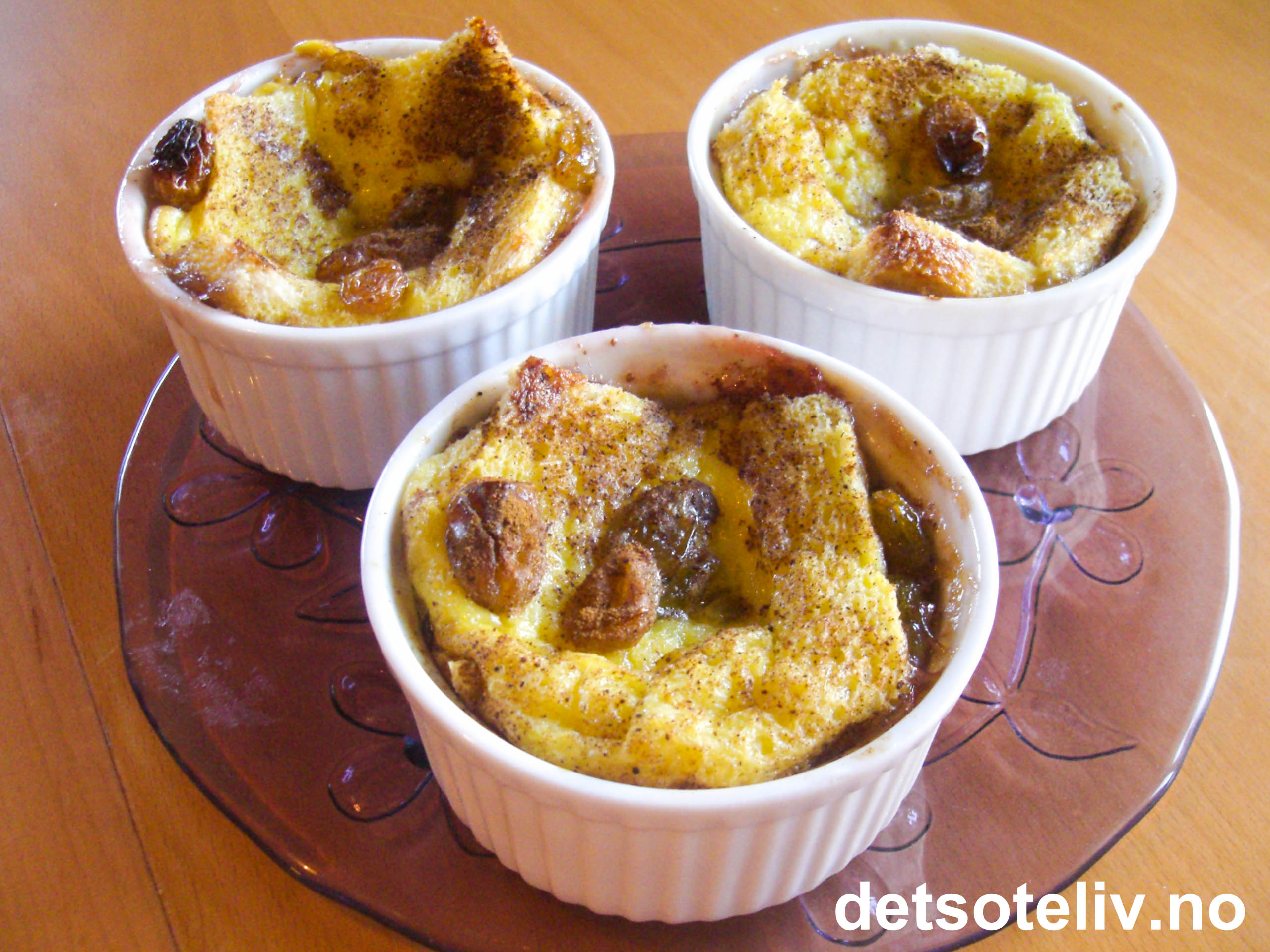 Ta formene ut av kjøleskapet og sett på en stekeplate. Stek brødpuddingene nederst i ovnen ved 180°C i ca 30-40 min.