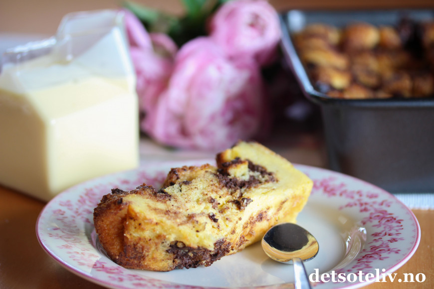 Se også oppskrift på vanlig "Brødpudding", "Brødpudding med tørket frukt", "Brødpudding med rom og rosiner" og "Brødpudding med pasjonsfrukt".